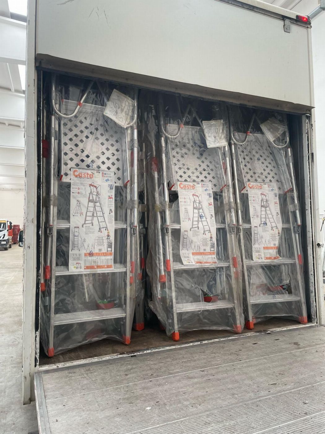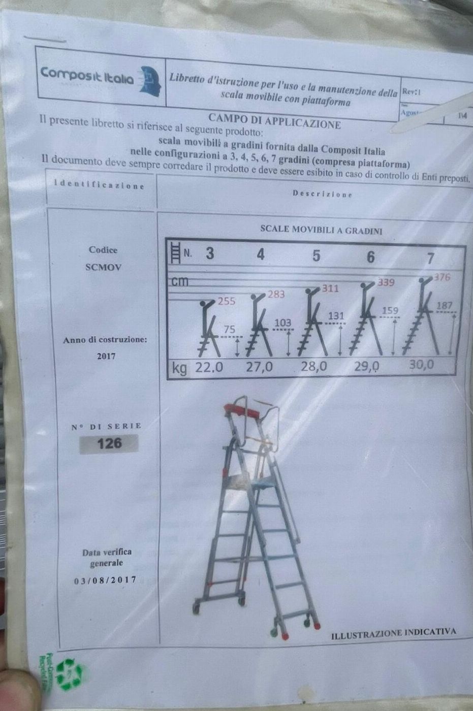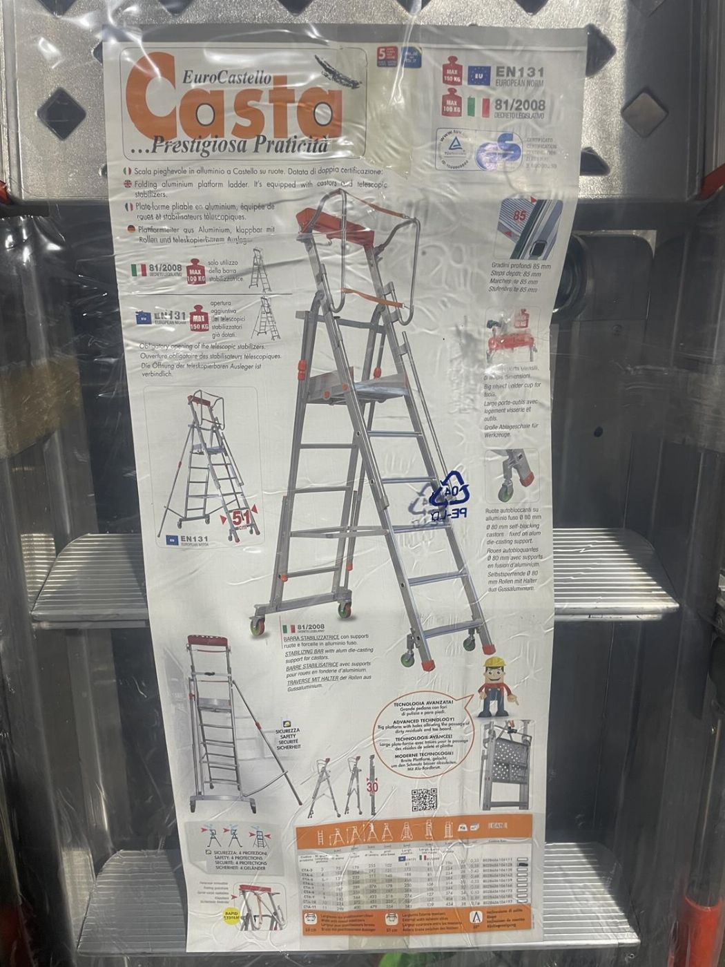 n. 10 Escales professionals d'alumini amb plataforma i rodes marca FACAL model CTA-4: Escala a castell 3 graons més plataforma, noves, embalades i amb certificació