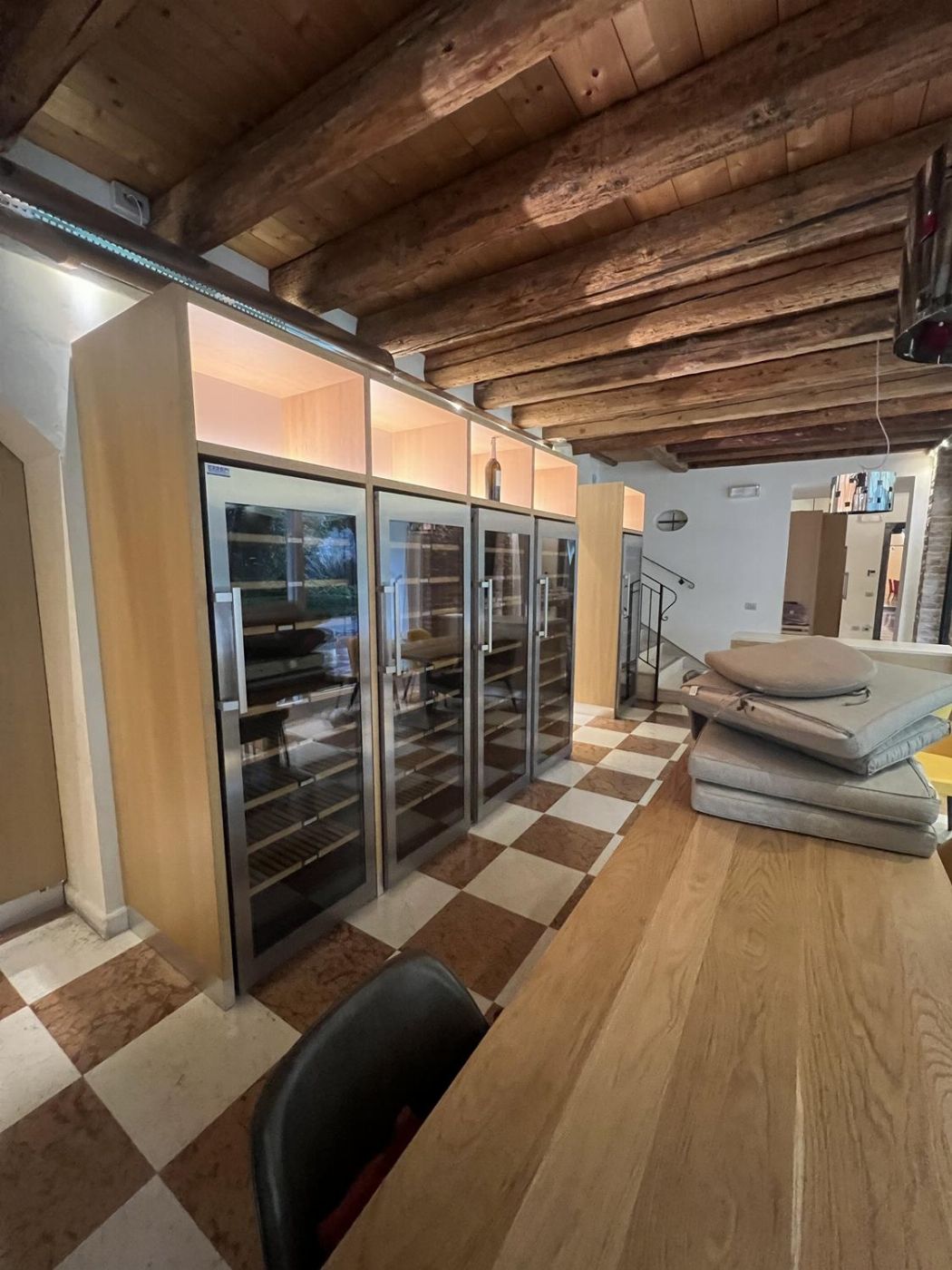 n. 1 Structure avec un compartiment porte-cave et un compartiment ouvert supérieur réalisée sur mesure, installée au mur, réalisée en stratifié de bois type chêne naturel. Hauteur totale estimée : environ 2,50 m, largeur totale : 0,80 m.
