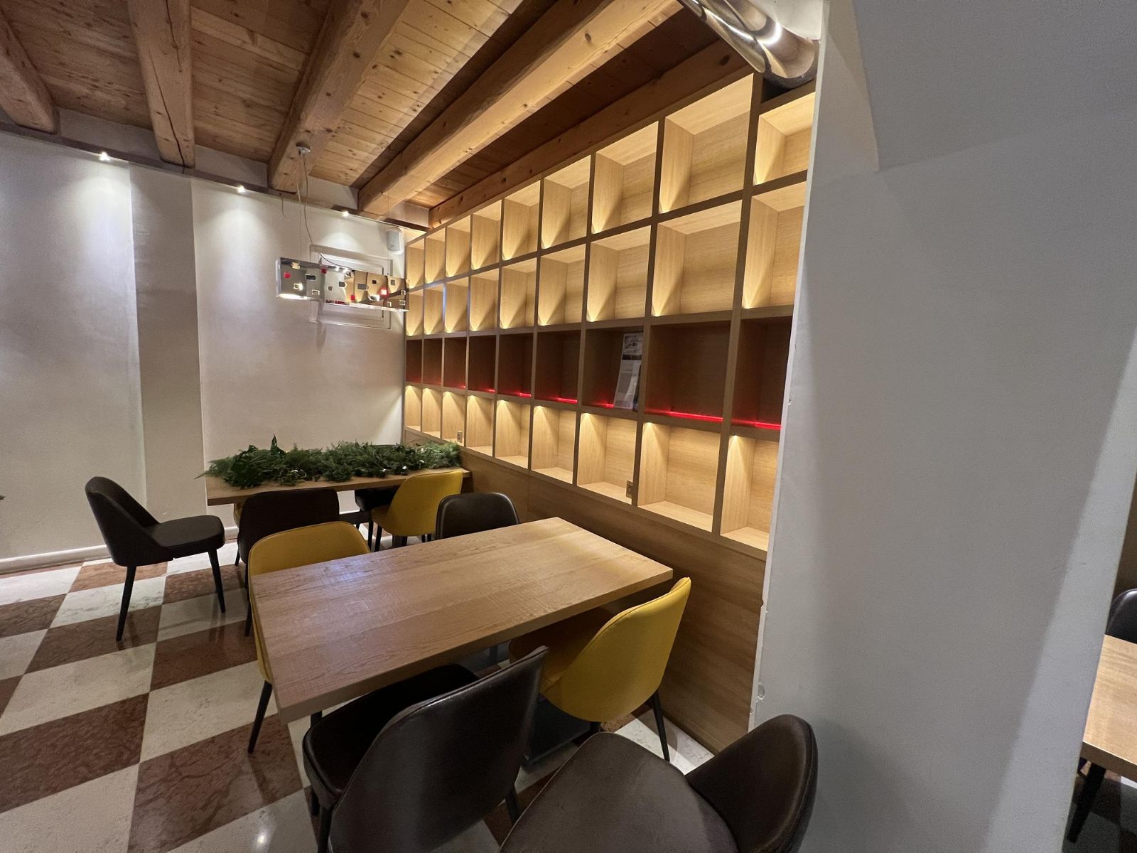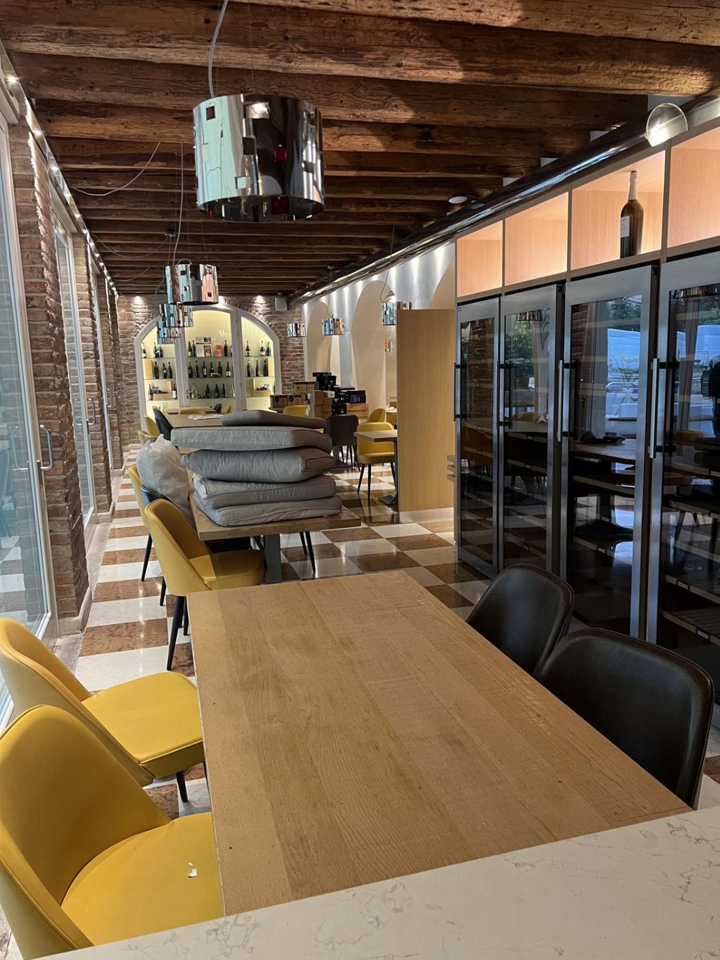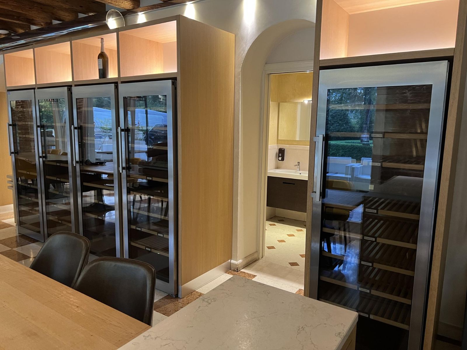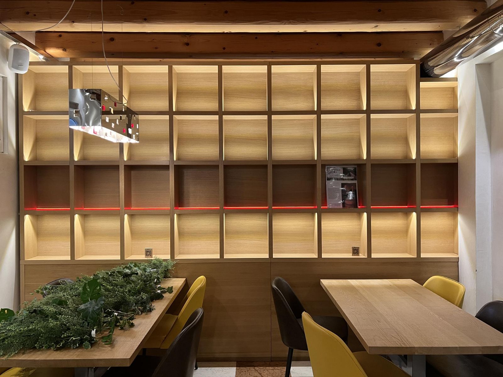 n. 1 Structure avec 4 compartiments porte-cave et quatre compartiments ouverts supérieurs réalisée sur mesure, installée au mur, réalisée en stratifié de bois type chêne naturel. Hauteur totale estimée : environ 2,50 m, largeur totale : 3,20 m.