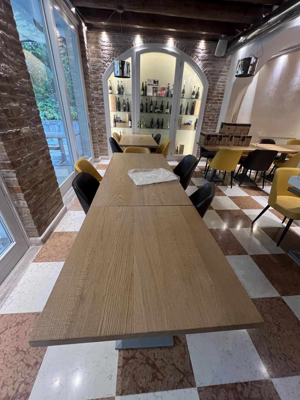 n. 10 Table rectangulaire avec structure à double base en métal peint gris et plateau en bois type chêne naturel, dimensions environ cm 140/160x70x75