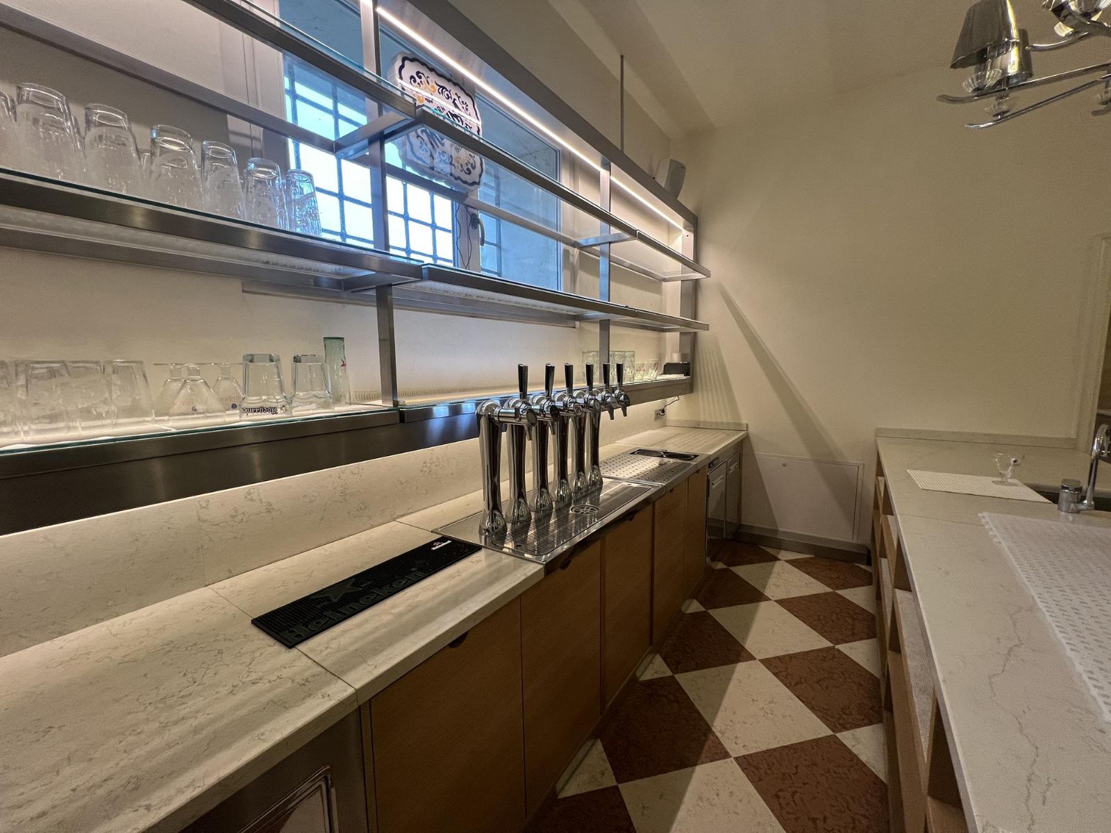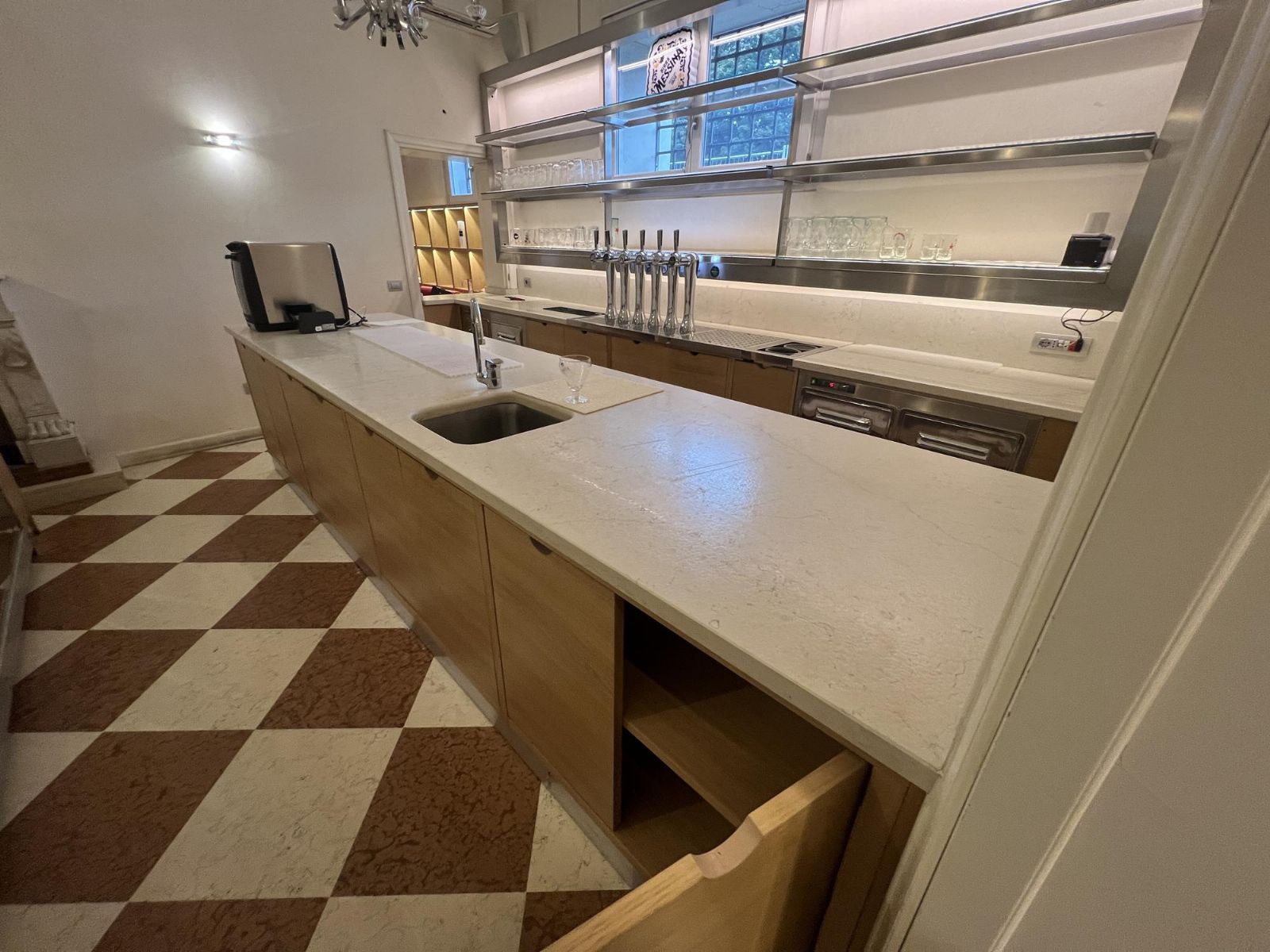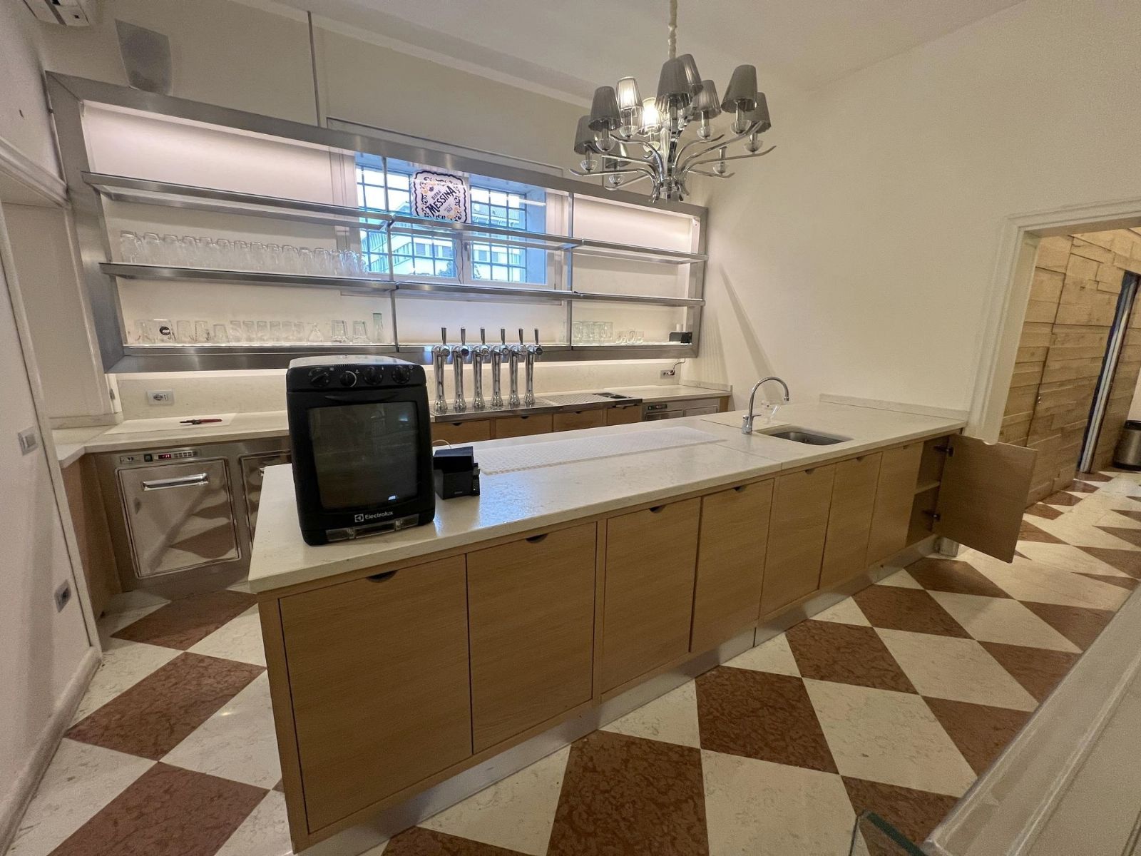 n. 1 Comptoir de bar avec structure en bois type chêne naturel avec n. 24 compartiments, plan en marbre blanc, évier à une cuve en acier inoxydable, dimensions environ cm 390x100x95