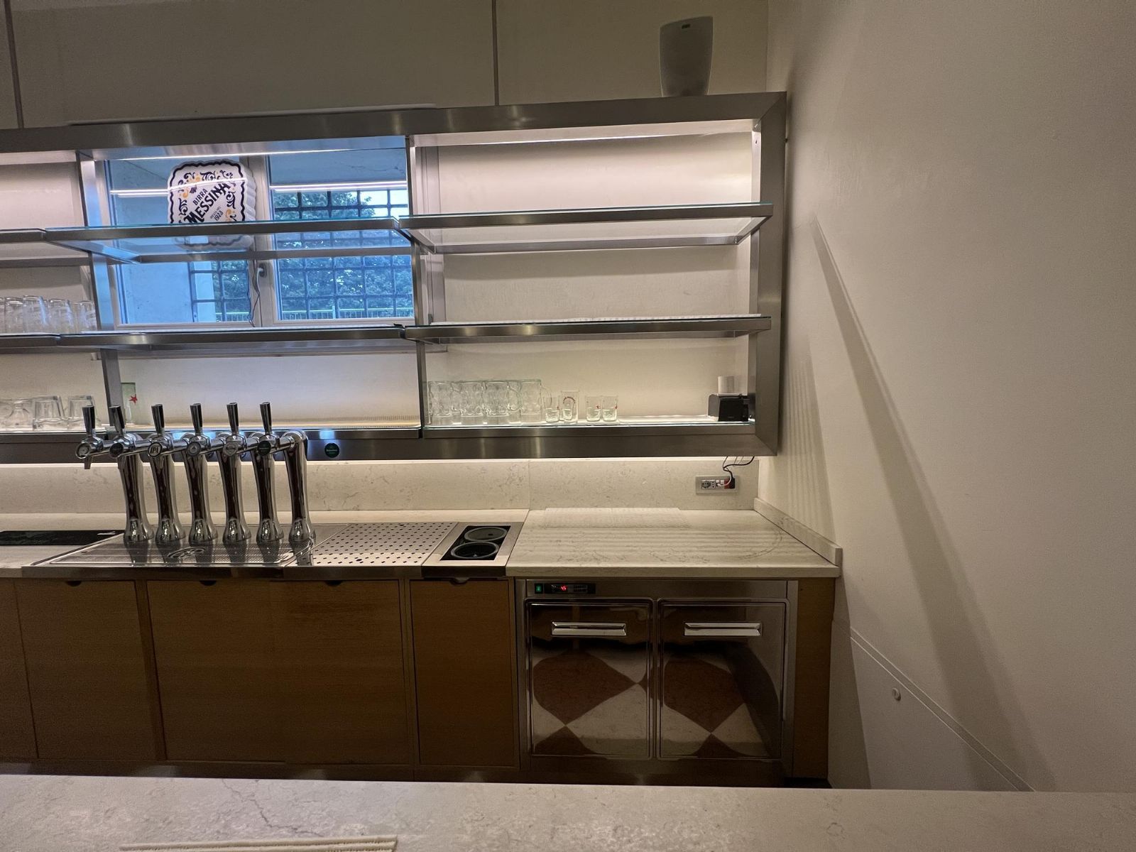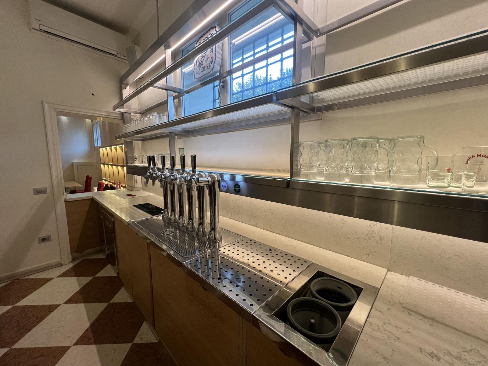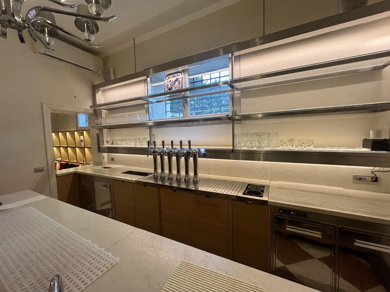 n. 1 Comptoir de bar avec structure en stratifié type chêne naturel, n. 5 portes battantes, plan en marbre, n. 2 trous circulaires pour l'élimination des déchets, n. 2 armoires réfrigérées en acier inoxydable à deux portes battantes marque MODULSYSTEM modèle ECOMSS2C année 2018, dimensions environ cm 465x70x85, étagère porte-verres avec structure en acier inoxydable et n. 3 étagères en verre, dimensions environ cm 435x20x80