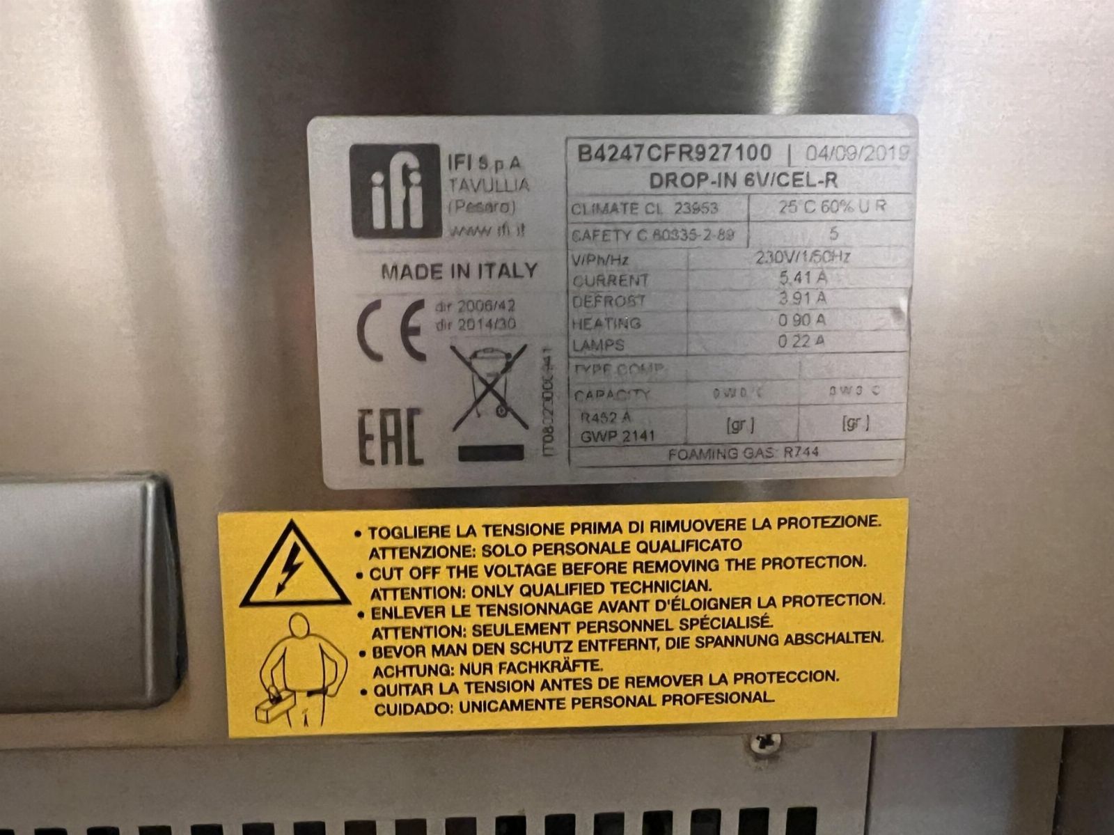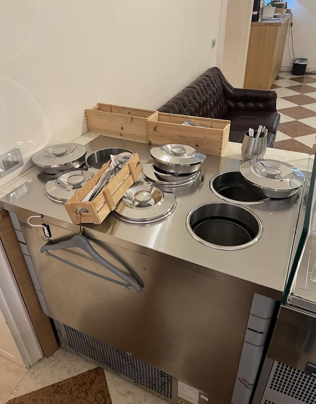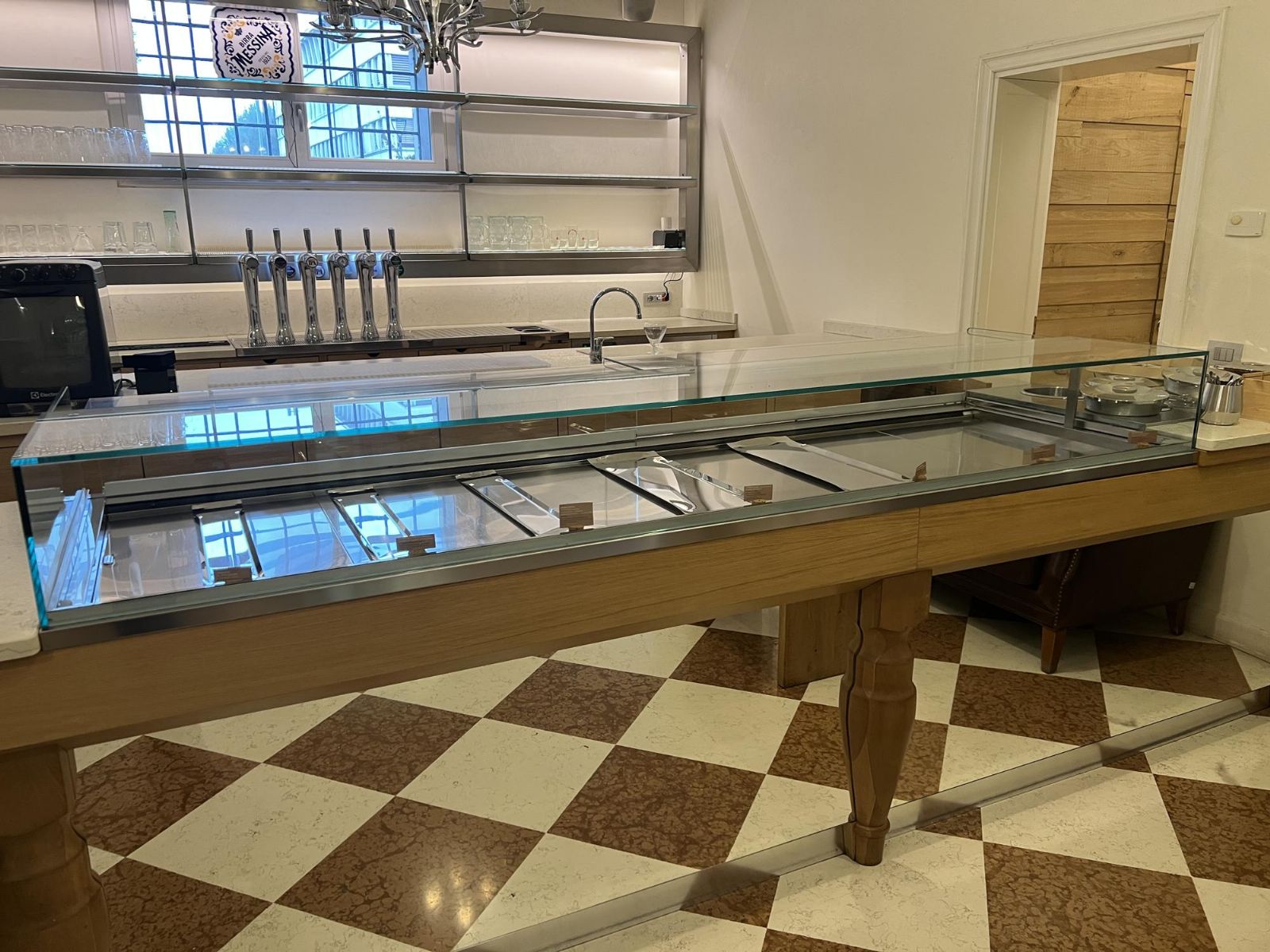 n. 1 COMPTOIR POUR DESSERTS ET GLACES - Comptoir frontal en bois massif avec plan de travail en marbre blanc, panneau réfléchissant transversal appliqué entre les pieds du comptoir, pieds tournés dans un style classique, vitrine entièrement en acier inoxydable réfrigérée marque IFI modèle DROP-IN 6V/CEL-R année 2019, avec plan supérieur en verre, équipée de bacs pour récipients en inox avec couvercles hermétiques et n. 4 portes battantes, armoire réfrigérée avec n. 6 bacs circulaires inox porte-conteneurs marque MONDIAL FRAMEC modèle E4369S2000 capacité lt 220, dimensions totales environ cm 390x85x85
