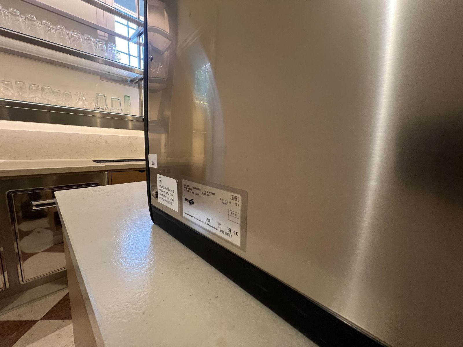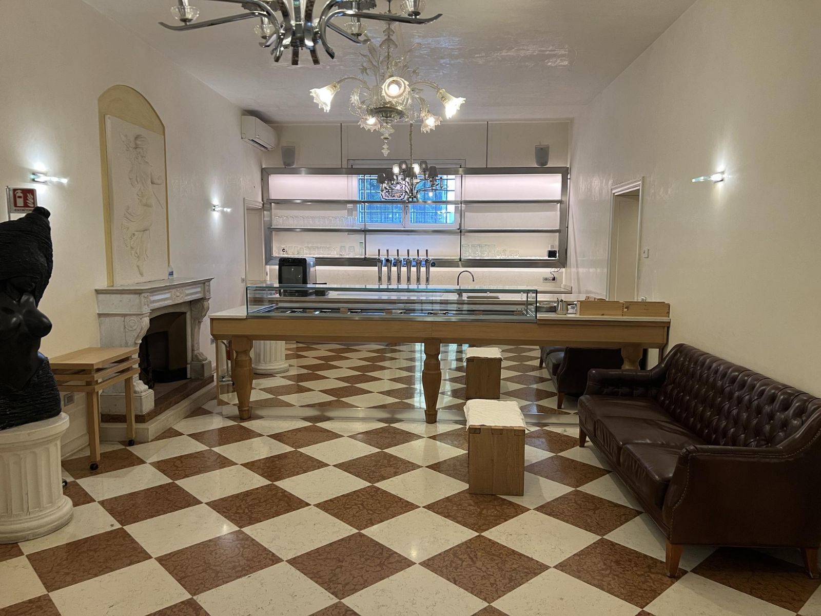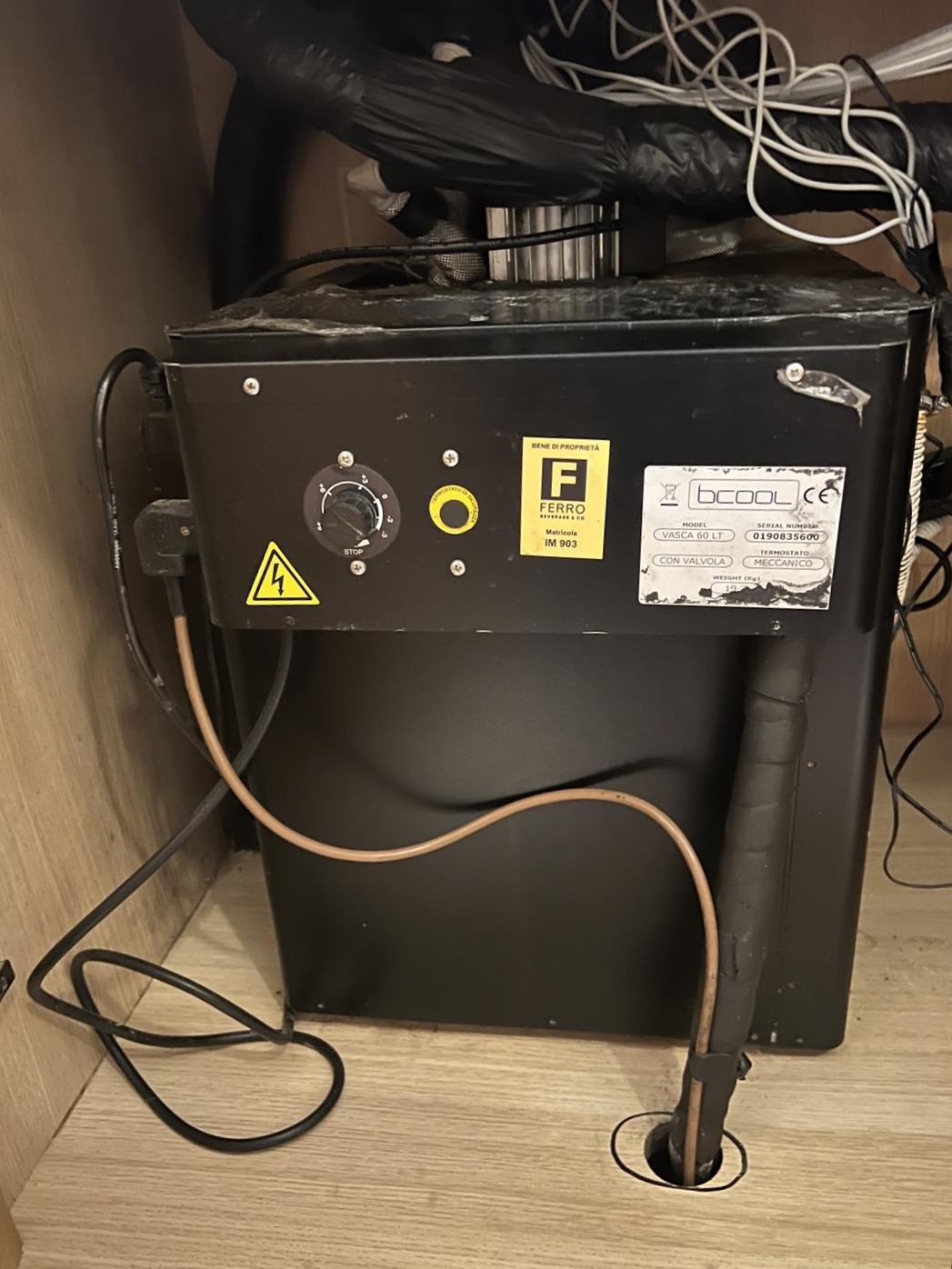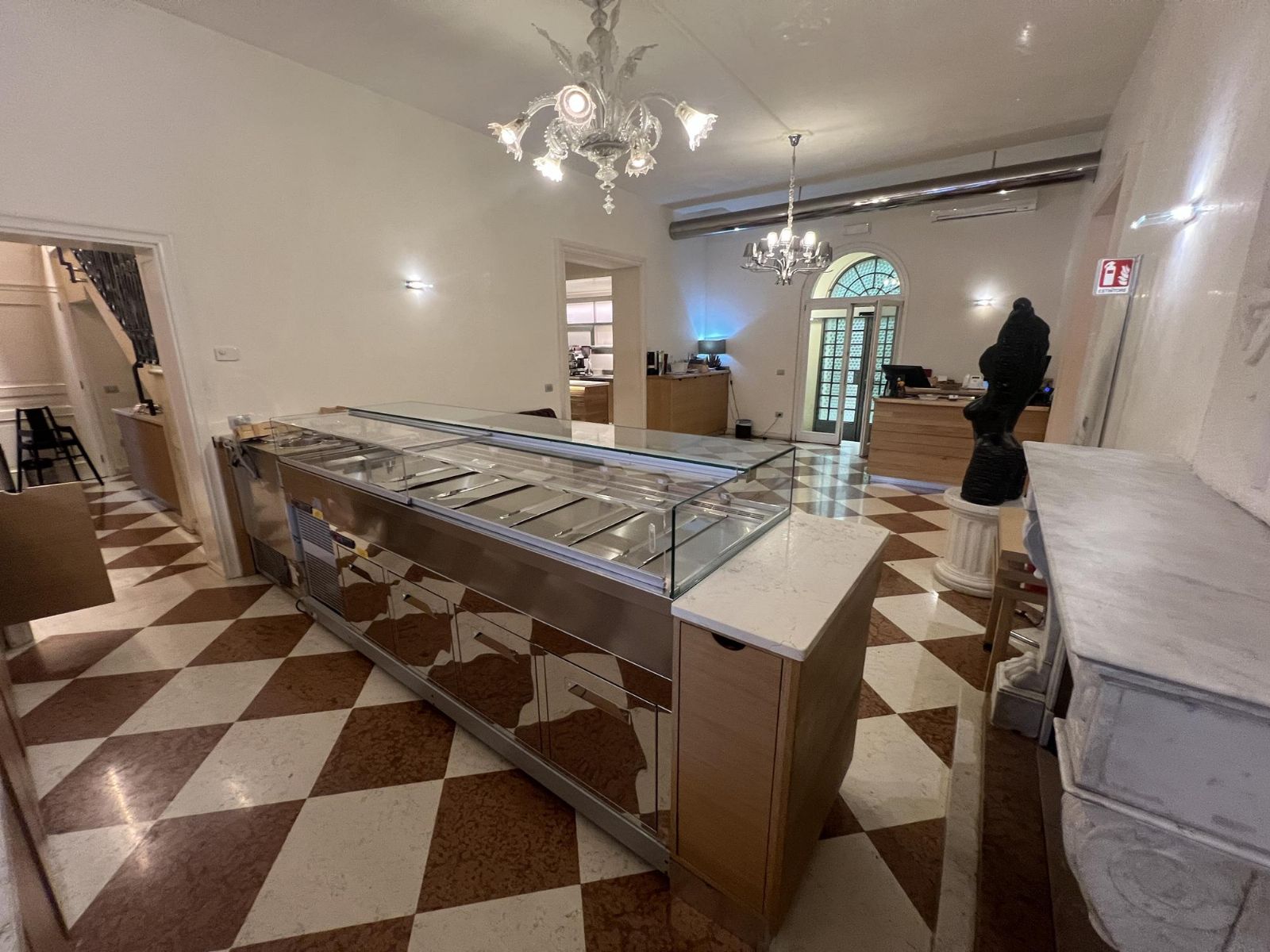 n. 1 COMPTOIR POUR DESSERTS ET GLACES - Comptoir frontal en bois massif avec plan de travail en marbre blanc, panneau réfléchissant transversal appliqué entre les pieds du comptoir, pieds tournés dans un style classique, vitrine entièrement en acier inoxydable réfrigérée marque IFI modèle DROP-IN 6V/CEL-R année 2019, avec plan supérieur en verre, équipée de bacs pour récipients en inox avec couvercles hermétiques et n. 4 portes battantes, armoire réfrigérée avec n. 6 bacs circulaires inox porte-conteneurs marque MONDIAL FRAMEC modèle E4369S2000 capacité lt 220, dimensions totales environ cm 390x85x85