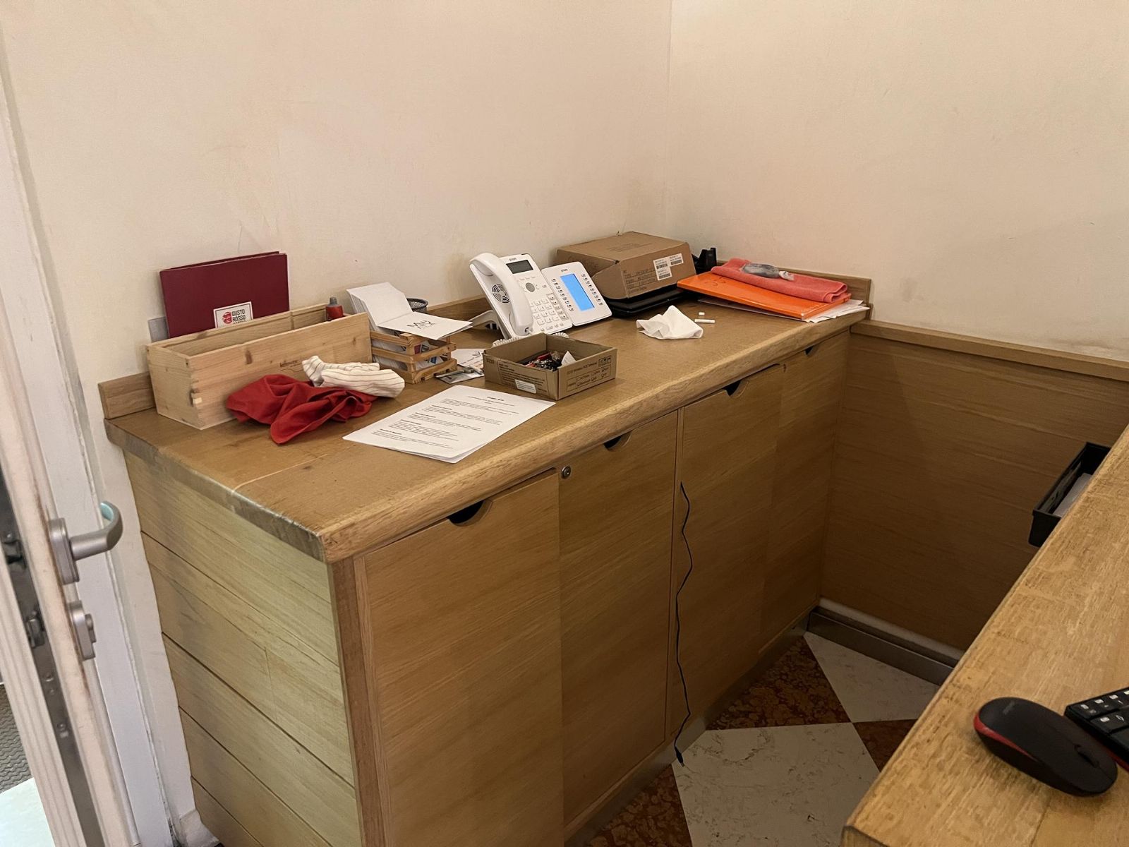 n. 1 Comptoir de caisse avec structure en bois type chêne naturel avec n. 4 portes battantes dimensions environ cm 155x65x90, arrière comptoir constitué par un comptoir armadié en bois type chêne naturel avec n. 4 portes battantes dimensions environ cm 155x65x90
