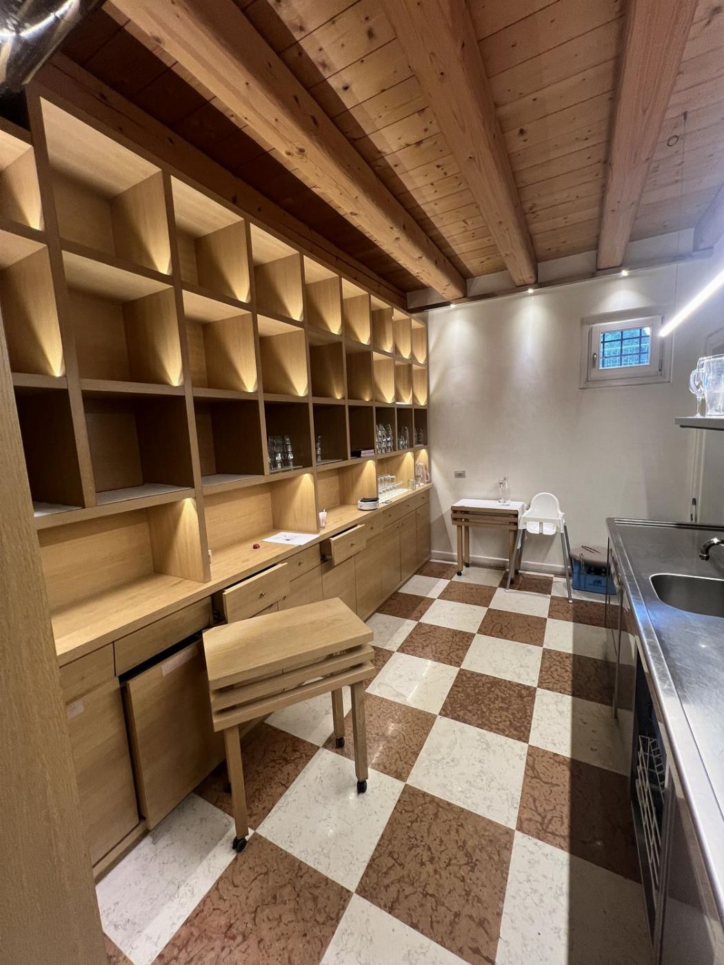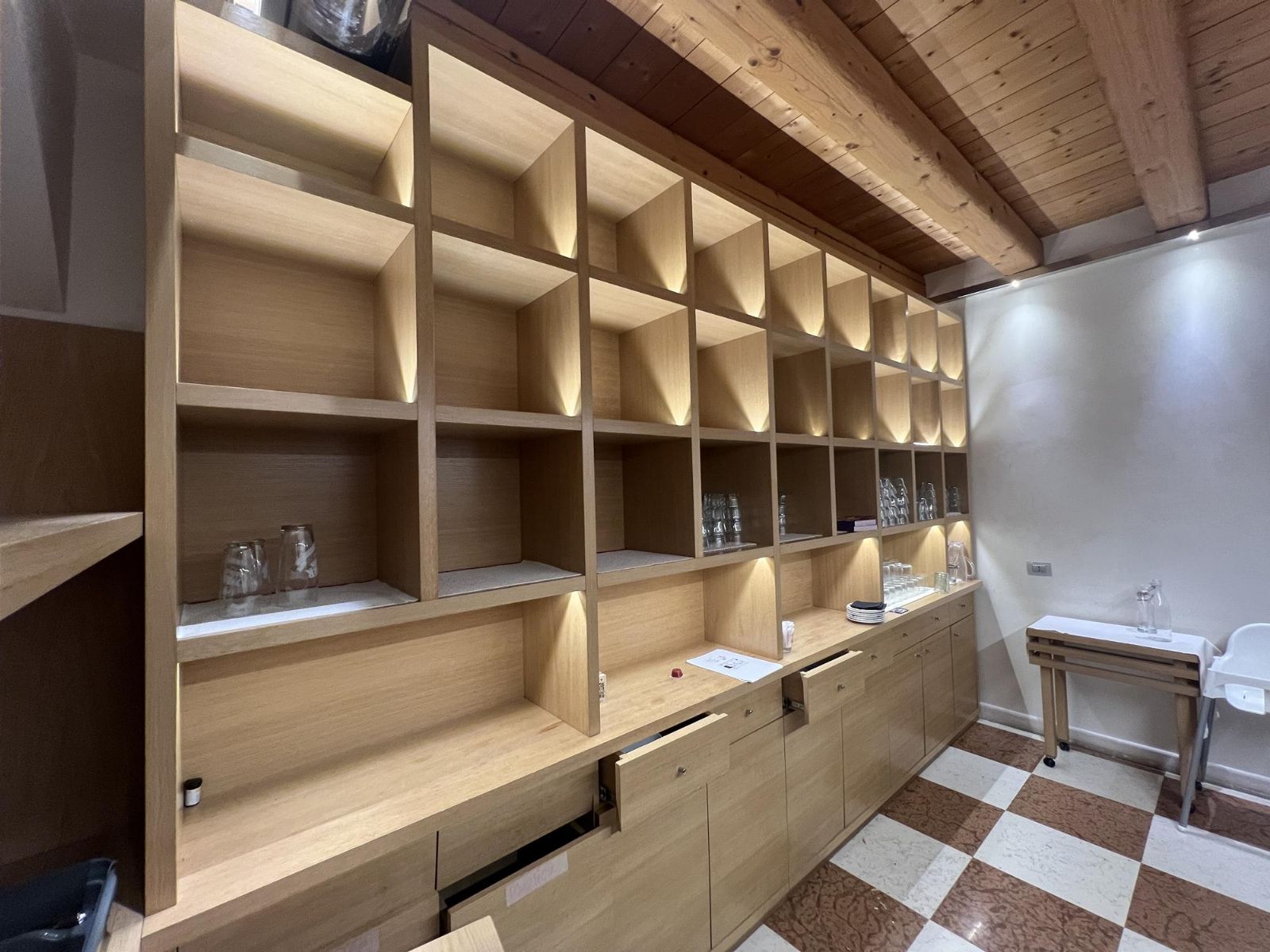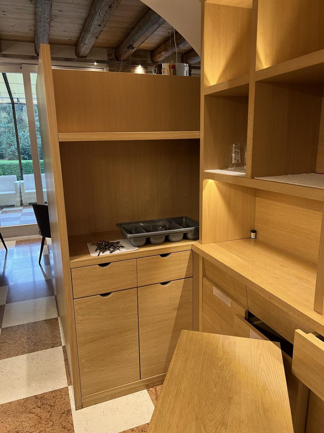 ν. 1 Δομή για μπουκάλια και ποτήρια κατασκευασμένη κατά παραγγελία, τοποθετημένη στον τοίχο, κατασκευασμένη από laminate ξύλου τύπου φυσικού δρυός. Με τετράγωνες κενές θέσεις και στην κάτω πλευρά 9 ανοιγόμενες πόρτες και 9 συρτάρια. Εκτιμώμενο συνολικό ύψος: περίπου 2,70 μ, συνολικό πλάτος: 4,50 μ