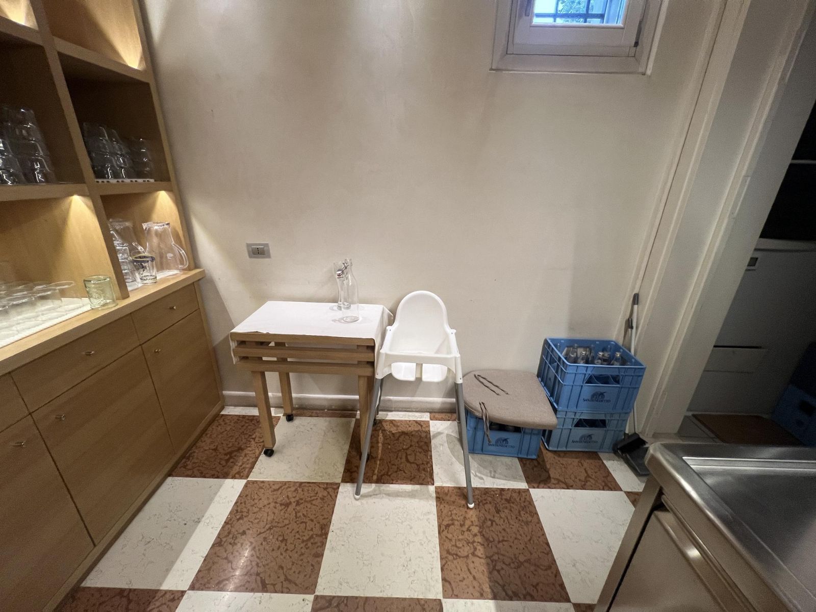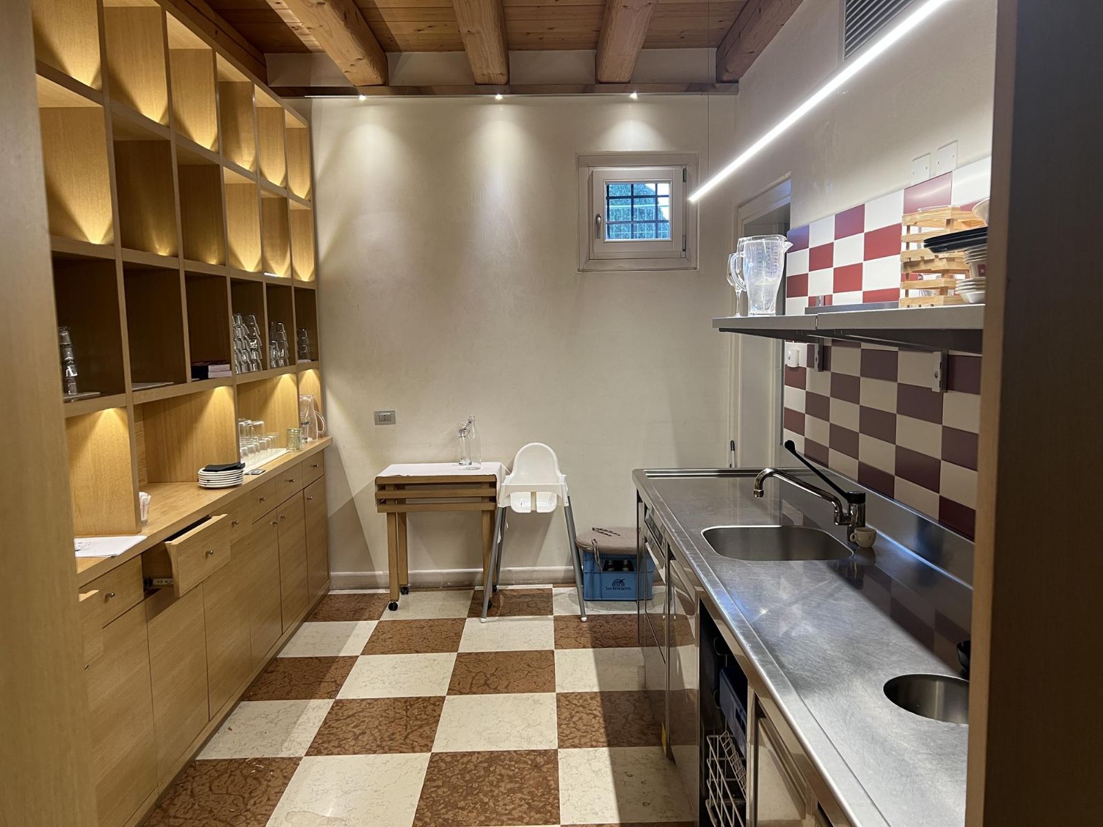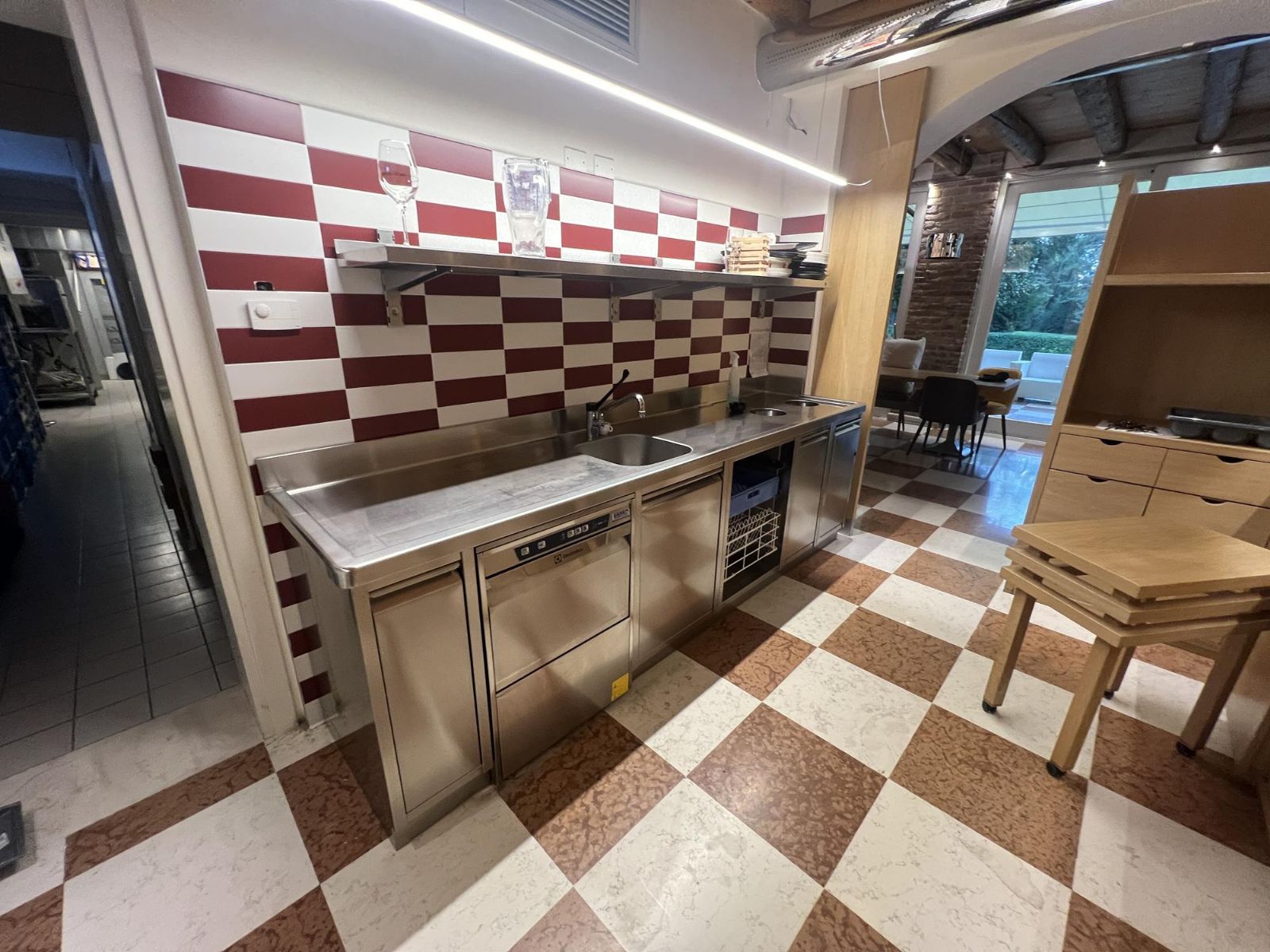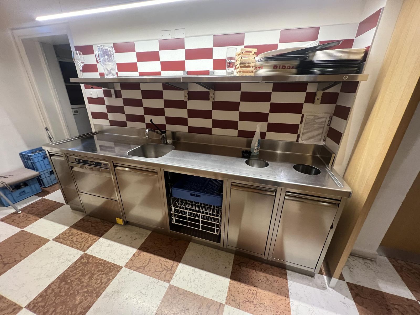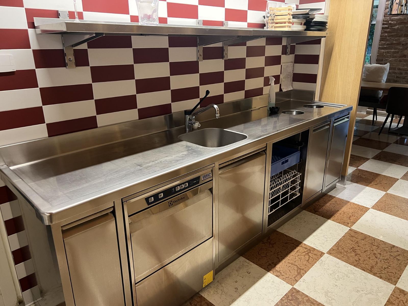 ν. 1 Υπηρεσιακός πάγκος με ντουλάπια για πλύσιμο πιάτων από ανοξείδωτο χάλυβα με ν. 4 ανοιγόμενες πόρτες, χώρο για πιάτα, νεροχύτη, πλυντήριο ποτηριών μάρκας WINE-LINE, διαστάσεις περίπου εκ 290x70x90. Ράφι τοίχου με στηρίγματα από ανοξείδωτο χάλυβα