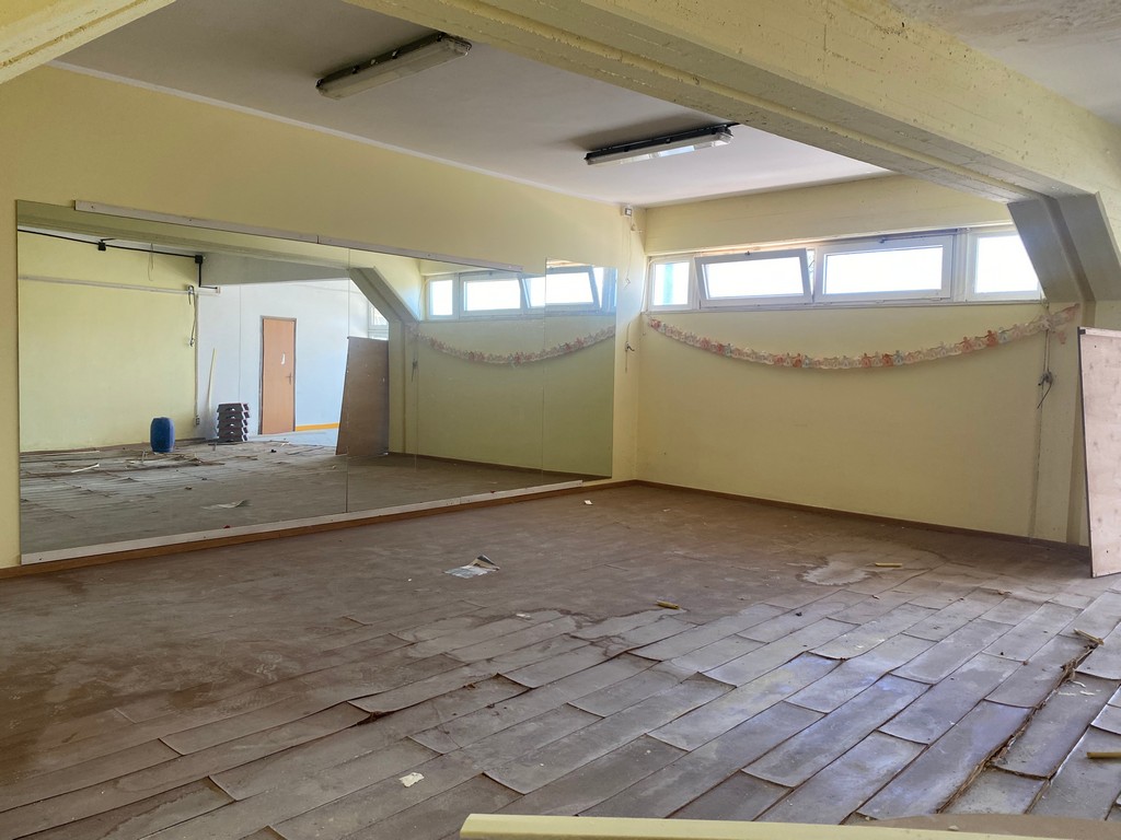 L’edificio, a tre elevazioni fuori terra, con superficie coperta di 744 mq ed altezza di 9.90 mt, è realizzato in un’area di circa 6.800 mq in comunicazione con il parcheggio del palazzetto, alla quale si accede da un ingresso in corrispondenza del confine ad est.