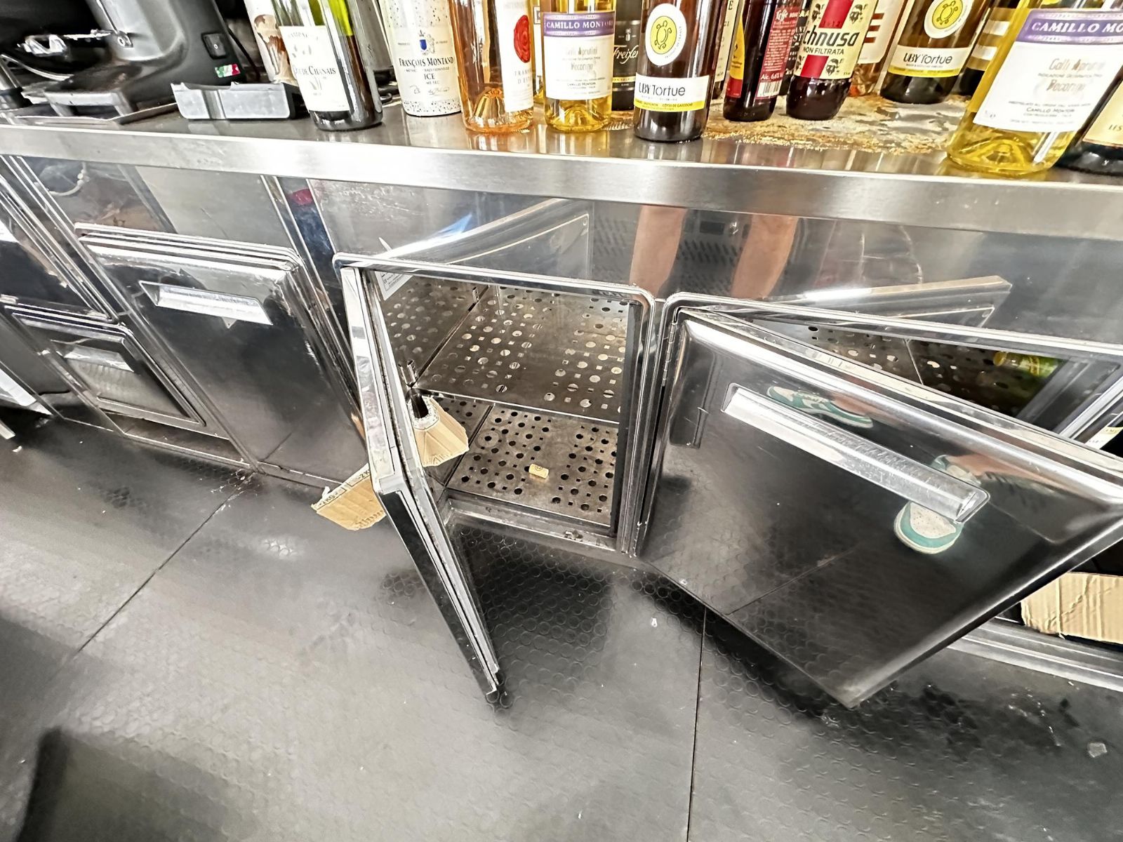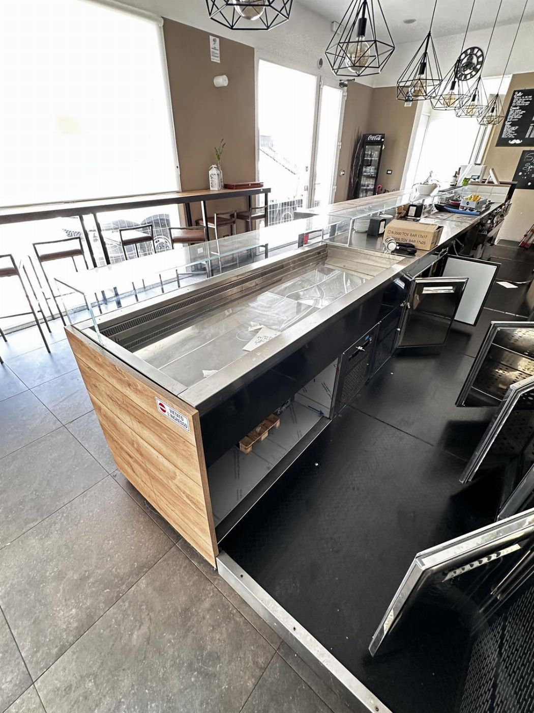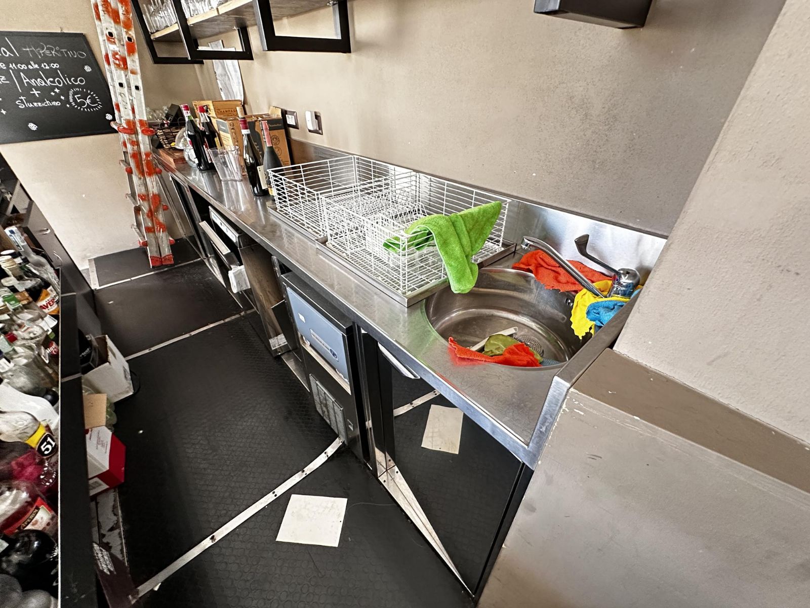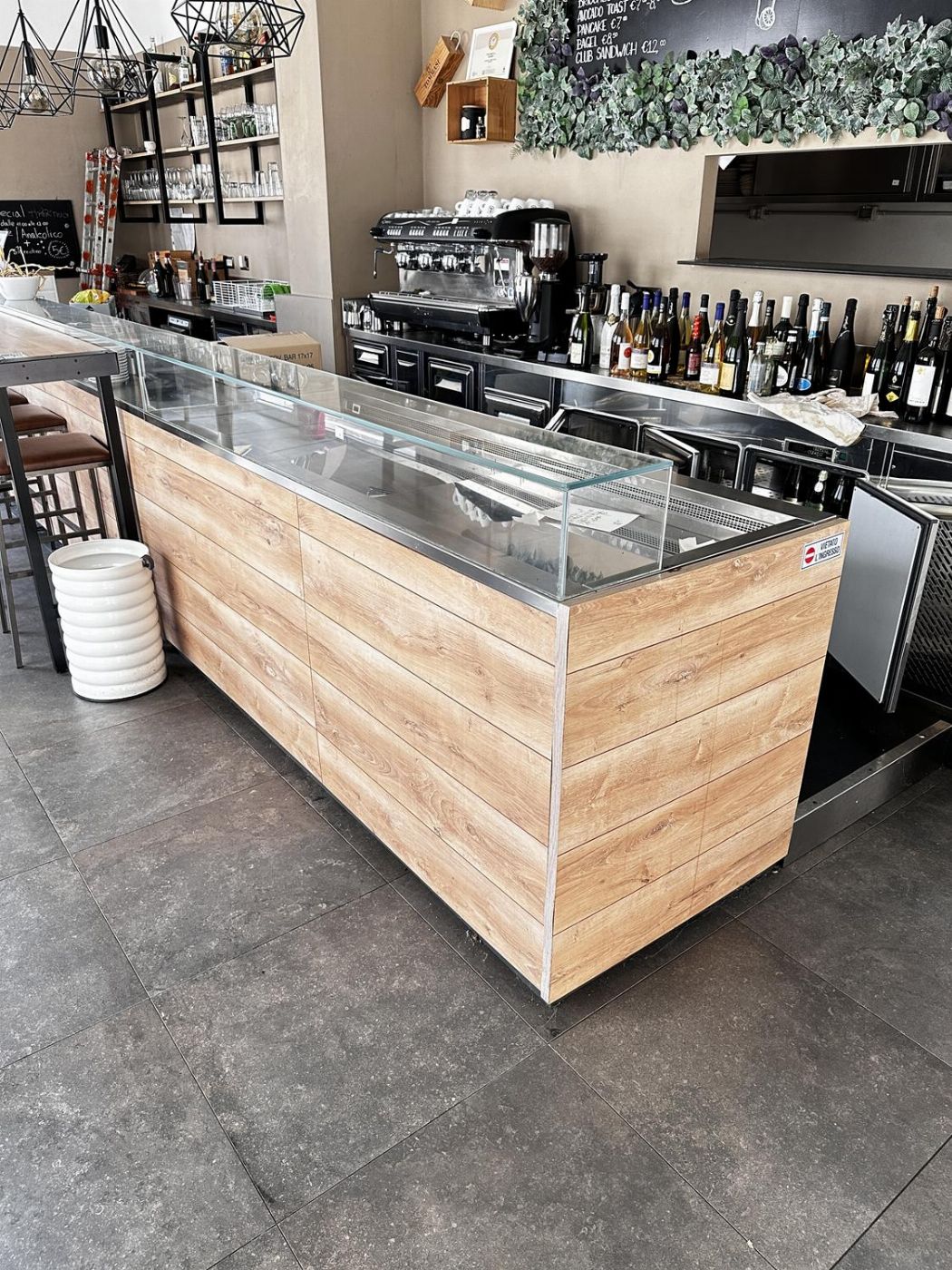 Arredo bancone bar in legno tipo rovere costituito da: vetrina riscatdante per alimenti marca MANCINELLI ELIO modello DROP-IN 2000+CnLDO anno 2019, banco refrigerato con n. 2 ante battenti e n. 2 vani giorno marca MANCINELLI ELIO modello CELLA 2 V. anno 2019, banco con n. 2 vani a giorno, mensola porta bottiglie e vasca, dimensioni complessive circa m 6x0,8x1,2. Vetro bancone costituito da n. 1 banco refrigerato in acciaio inox con n. 6 ante battenti e n. 4 cassetti marca MANCINELLI ELIO modello CELLA 3 V. anno 2019 dimensioni circa m 3x0,6x1 e n. 1 banco armadiato in acciaio inox con n. l anta battente, n. 2 vani giorno, n. 2 ante scorrevoli, lavello ad una vasca dimensioni circa m 3x0,6x1, n. 2 scaffalature a parete in metallo nero con n. 3 ripiani in legno - rif. 36
