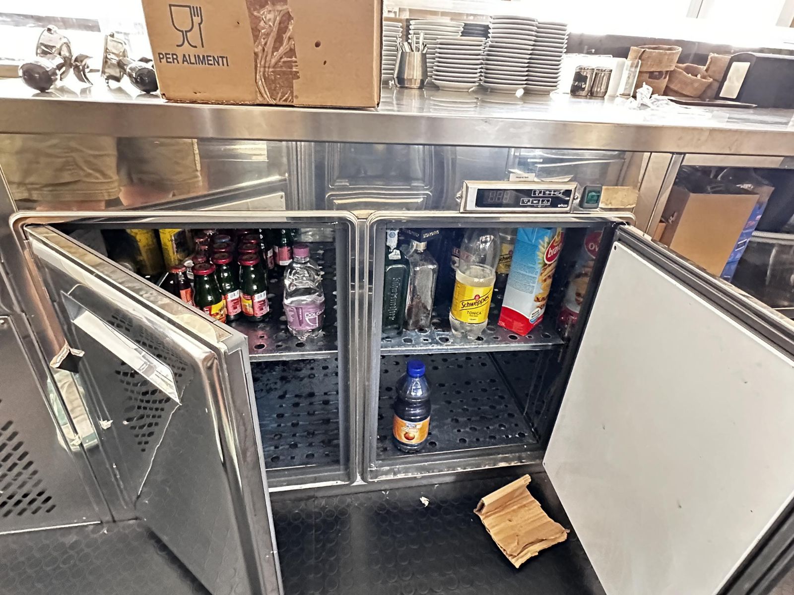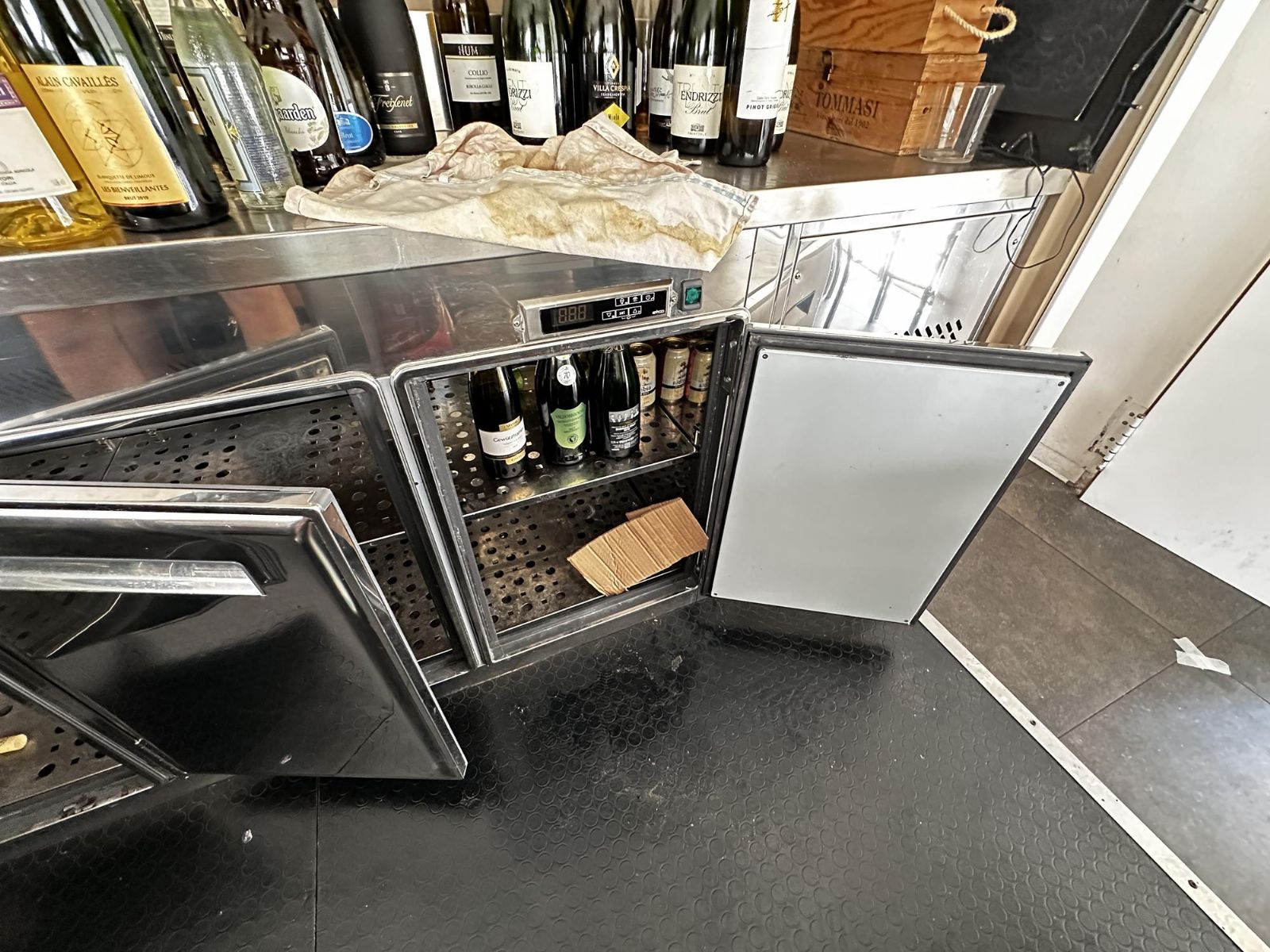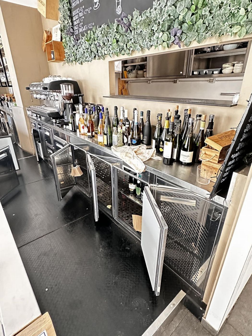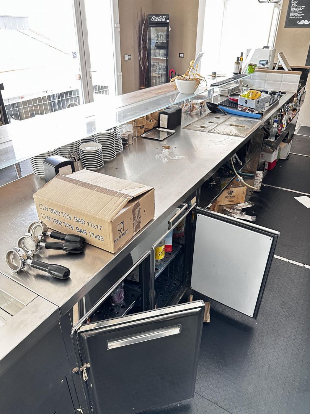 Arredo bancone bar in legno tipo rovere costituito da: vetrina riscatdante per alimenti marca MANCINELLI ELIO modello DROP-IN 2000+CnLDO anno 2019, banco refrigerato con n. 2 ante battenti e n. 2 vani giorno marca MANCINELLI ELIO modello CELLA 2 V. anno 2019, banco con n. 2 vani a giorno, mensola porta bottiglie e vasca, dimensioni complessive circa m 6x0,8x1,2. Vetro bancone costituito da n. 1 banco refrigerato in acciaio inox con n. 6 ante battenti e n. 4 cassetti marca MANCINELLI ELIO modello CELLA 3 V. anno 2019 dimensioni circa m 3x0,6x1 e n. 1 banco armadiato in acciaio inox con n. l anta battente, n. 2 vani giorno, n. 2 ante scorrevoli, lavello ad una vasca dimensioni circa m 3x0,6x1, n. 2 scaffalature a parete in metallo nero con n. 3 ripiani in legno - rif. 36