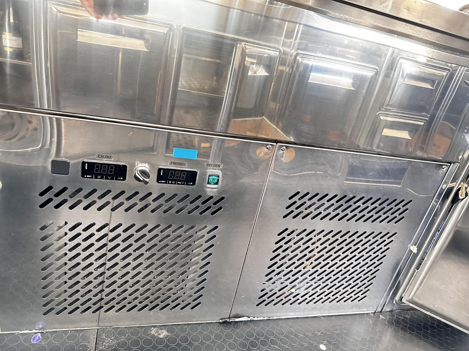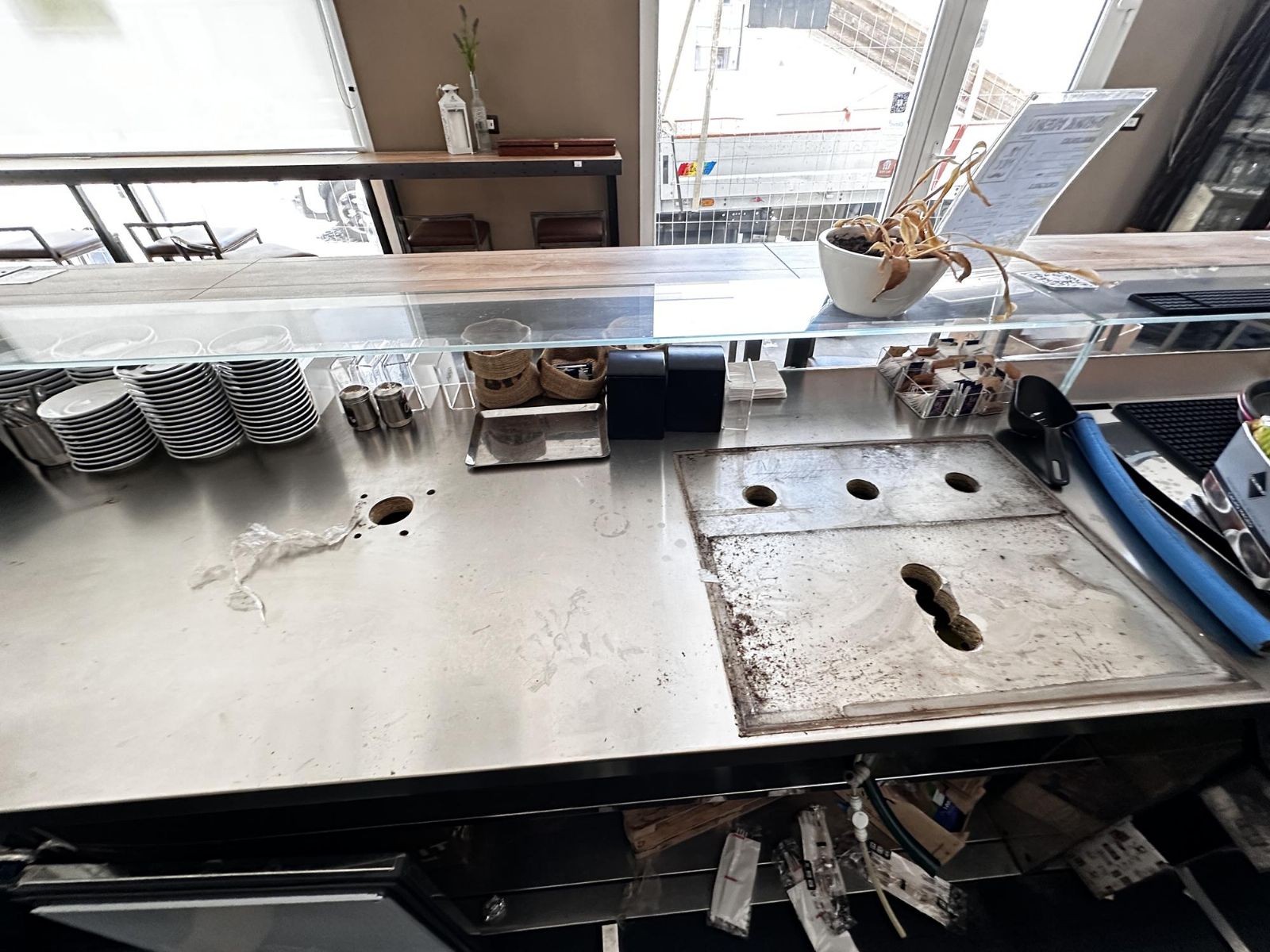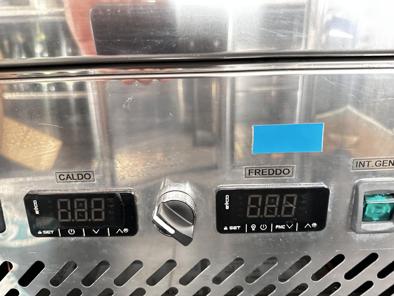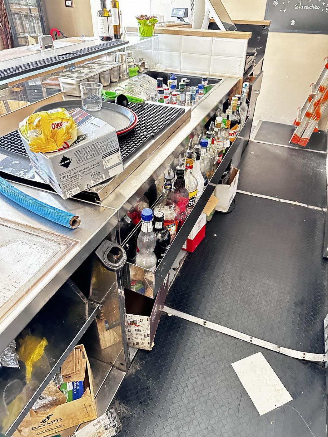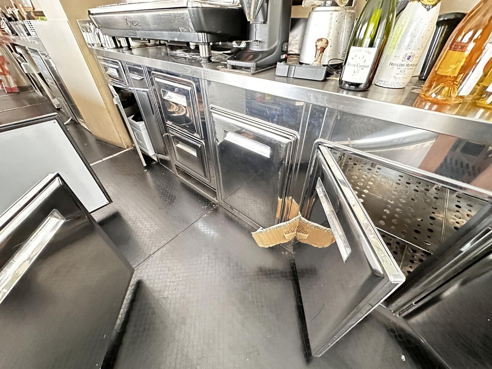 Arredo bancone bar in legno tipo rovere costituito da: vetrina riscatdante per alimenti marca MANCINELLI ELIO modello DROP-IN 2000+CnLDO anno 2019, banco refrigerato con n. 2 ante battenti e n. 2 vani giorno marca MANCINELLI ELIO modello CELLA 2 V. anno 2019, banco con n. 2 vani a giorno, mensola porta bottiglie e vasca, dimensioni complessive circa m 6x0,8x1,2. Vetro bancone costituito da n. 1 banco refrigerato in acciaio inox con n. 6 ante battenti e n. 4 cassetti marca MANCINELLI ELIO modello CELLA 3 V. anno 2019 dimensioni circa m 3x0,6x1 e n. 1 banco armadiato in acciaio inox con n. l anta battente, n. 2 vani giorno, n. 2 ante scorrevoli, lavello ad una vasca dimensioni circa m 3x0,6x1, n. 2 scaffalature a parete in metallo nero con n. 3 ripiani in legno - rif. 36