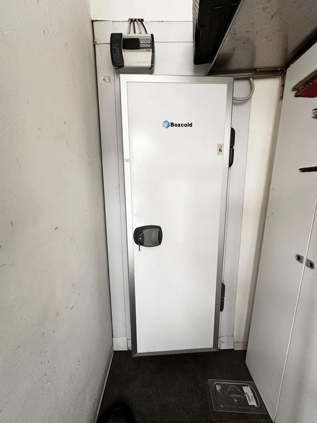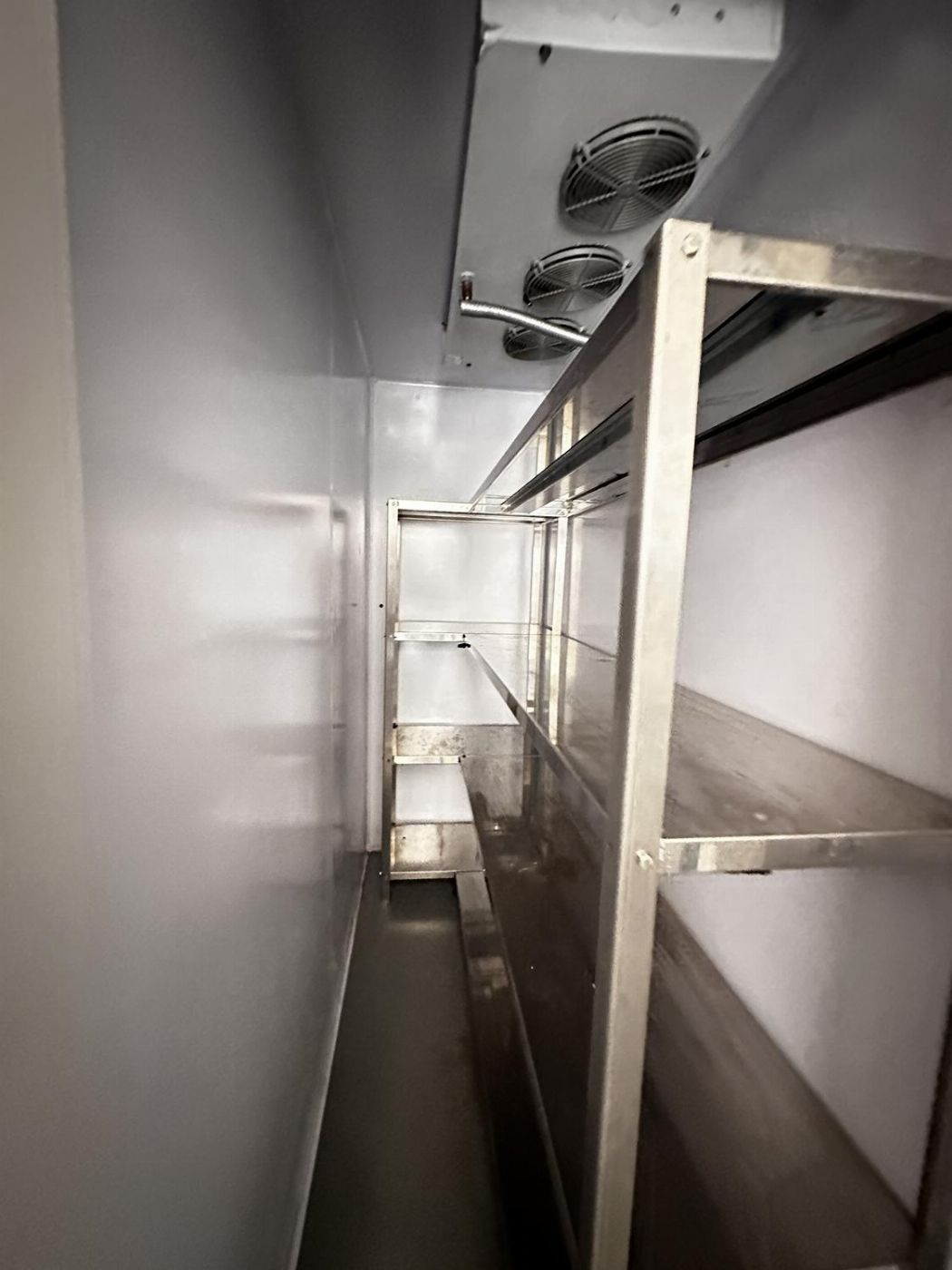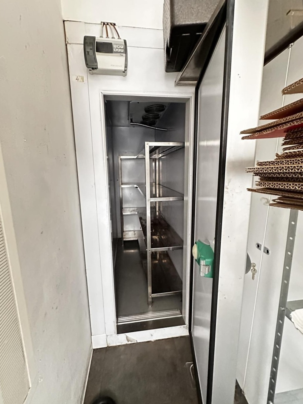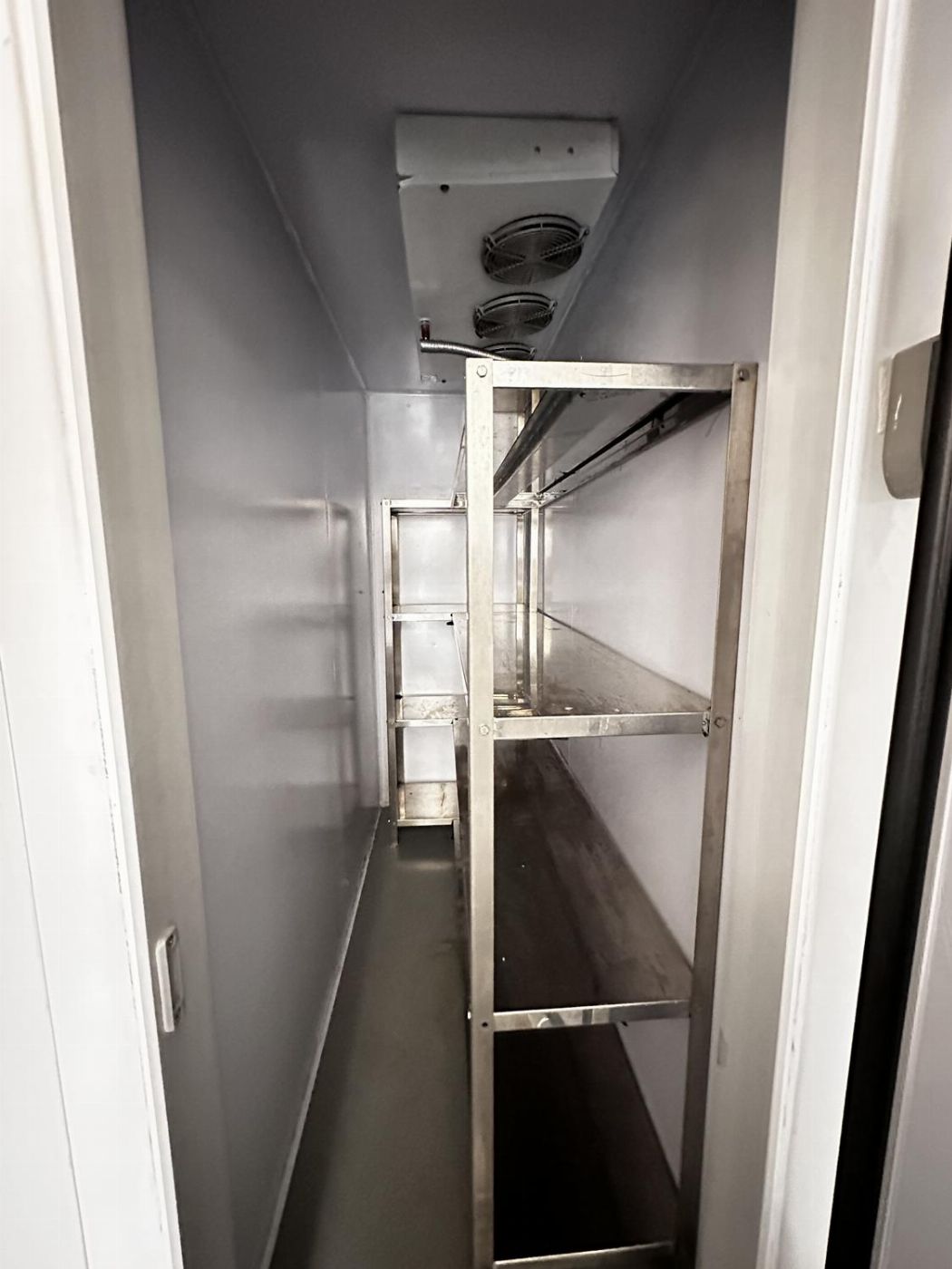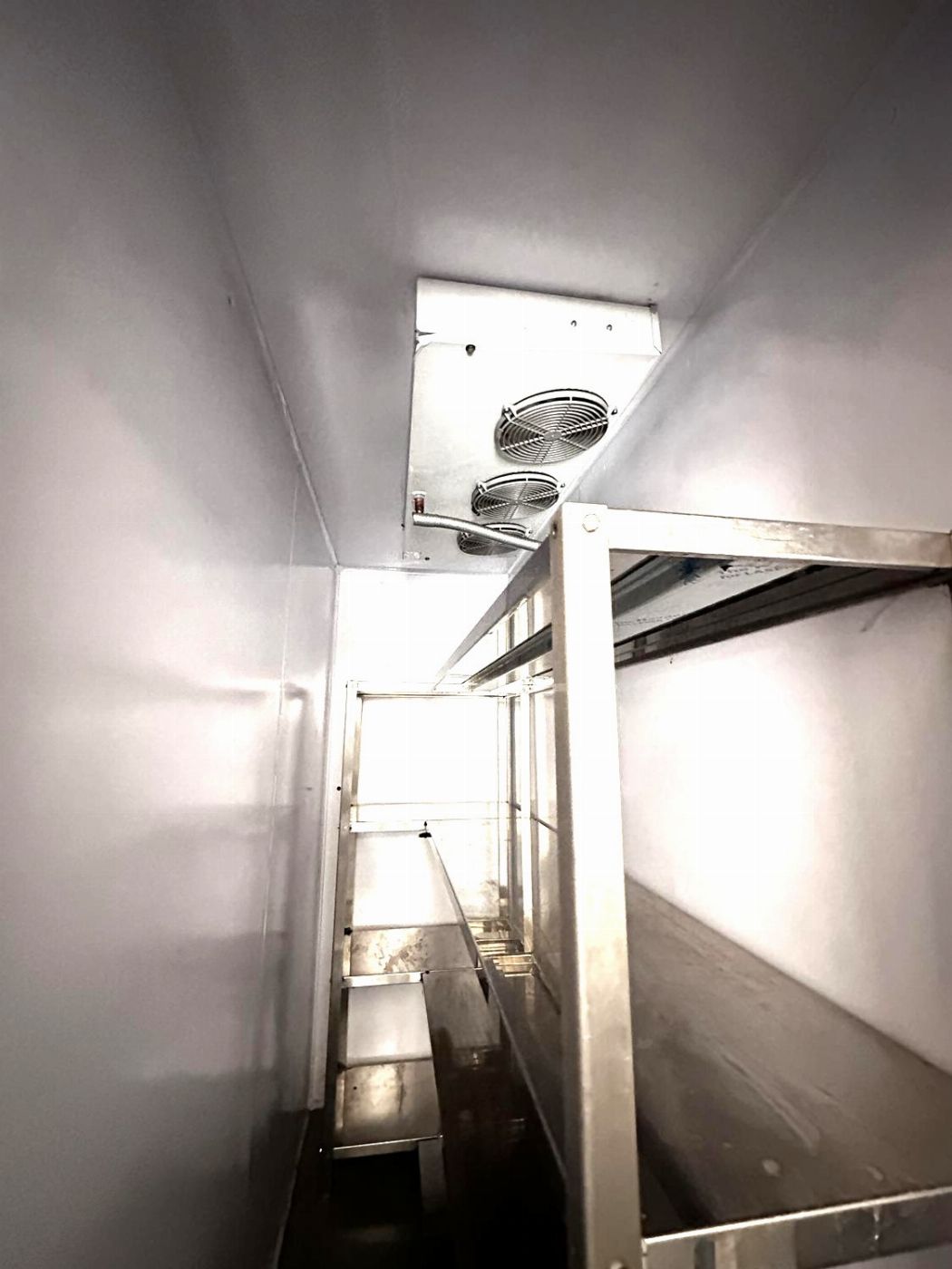 Cella frigorifera ad un anta battente con all'interno n. 2 scaffalature in acciaio inox, unità refrigerante marca RIVACOLD modello ERLI40Z6112 posizionata all'esterno - rif. 73