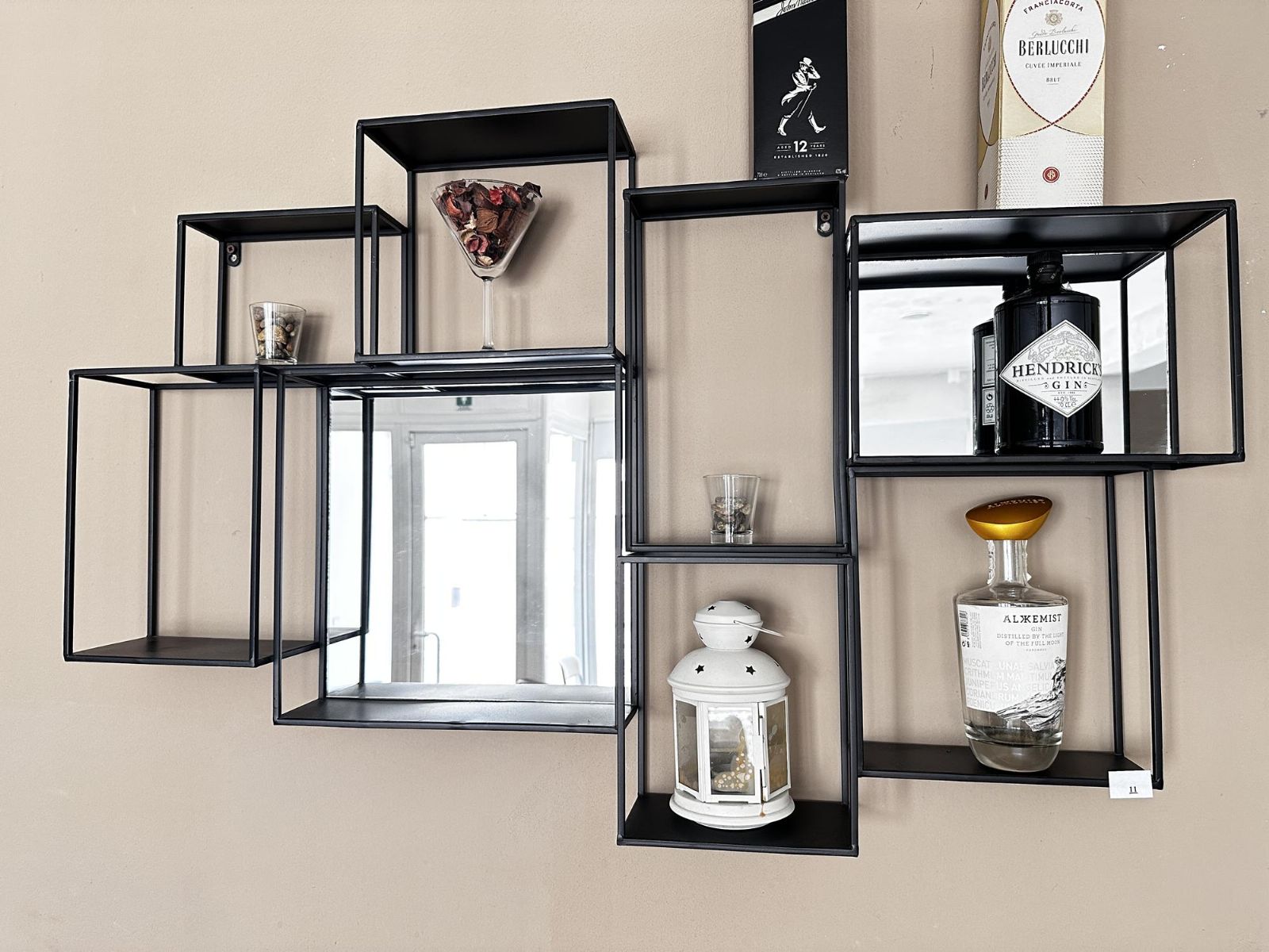 Scaffalatura a parete in metallo nero con 12 ripiani e due specchi posteriori dimensioni circa cm 120x20x90 - rif. 11