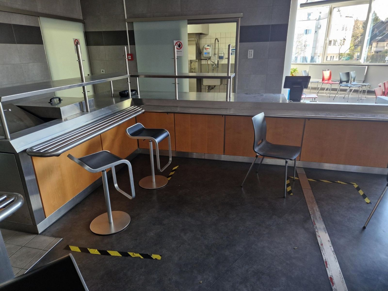 banco selfservice ad angolo - vista lato mensa, misure lato lungo 500X100X120h, lato corto 300X100X120h