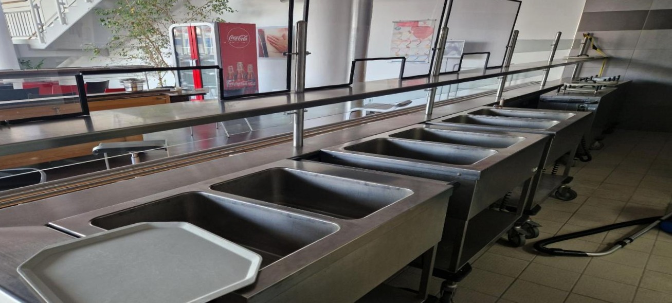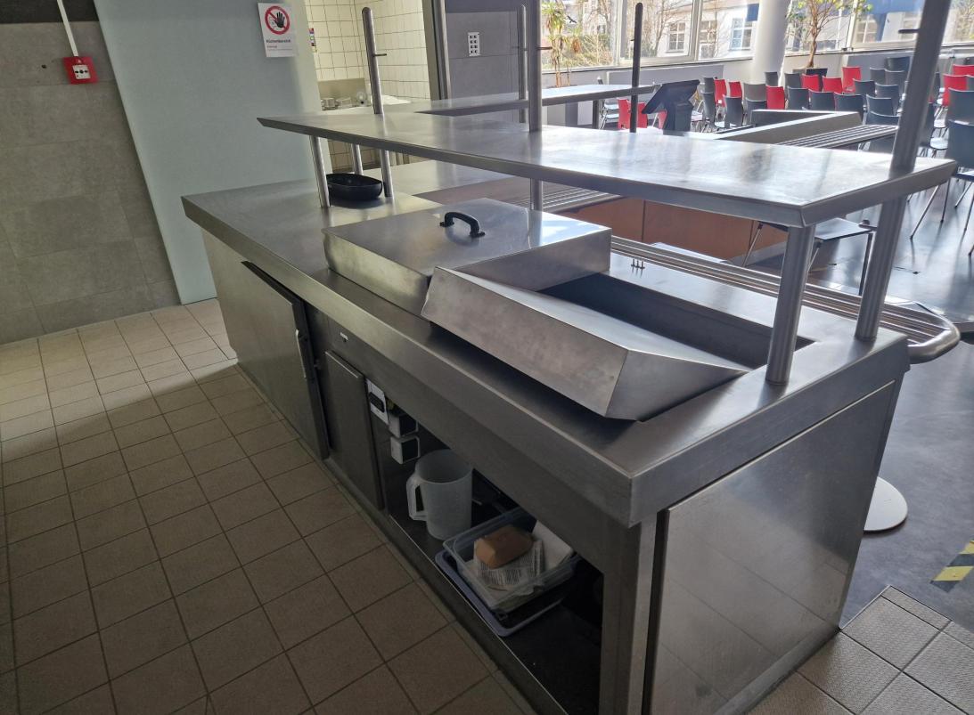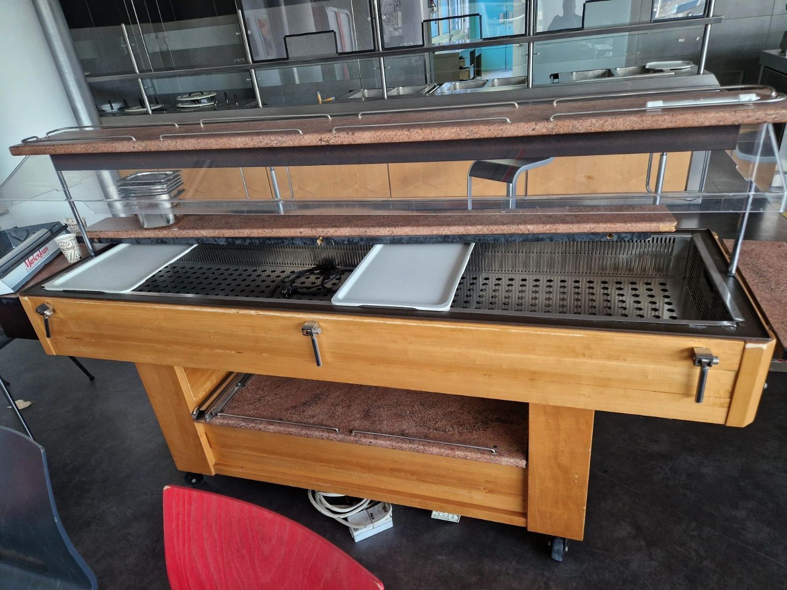 banco selfservice lineare, misure 600X100X120h, compreso di 3 carrelli portavivande estraibili e 2 carrelli porta piatti riscaldati