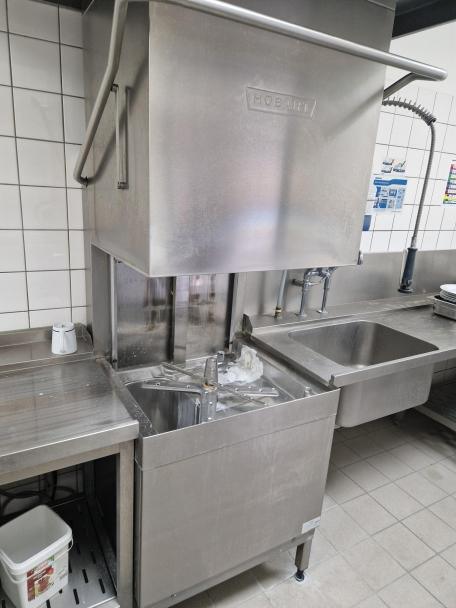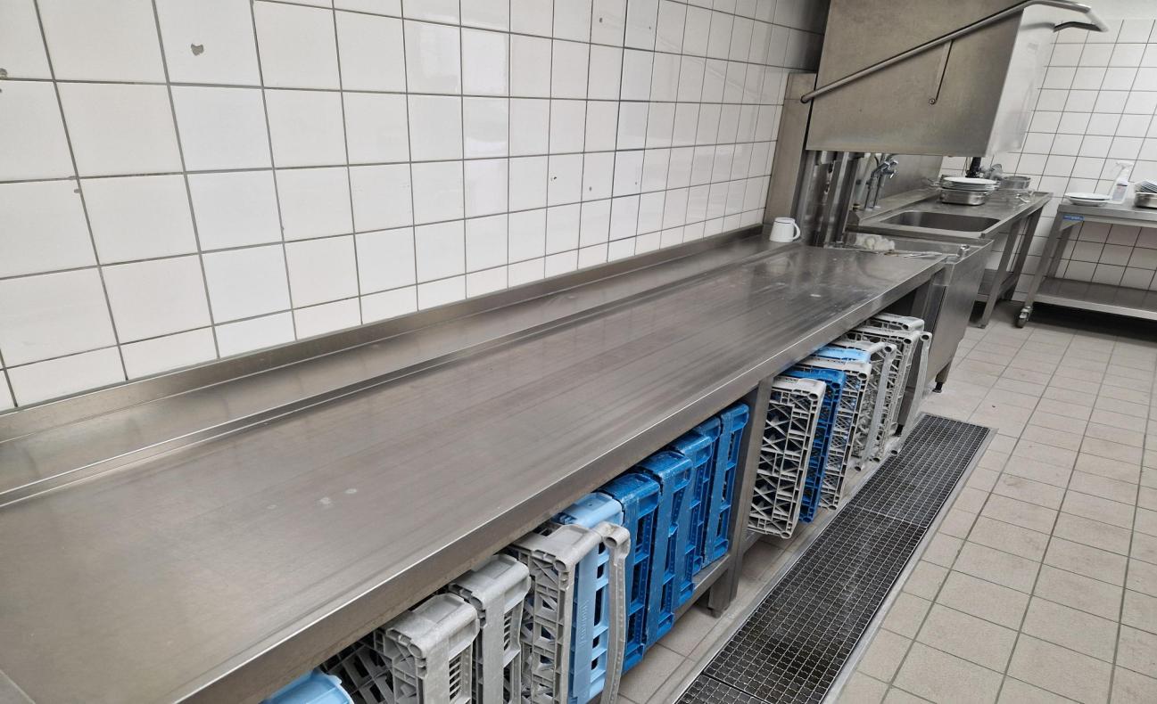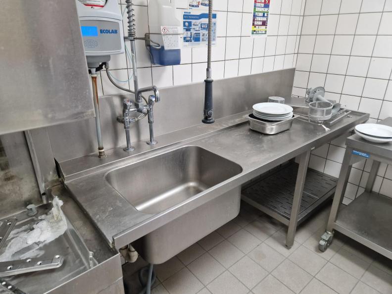 centro lavaggio stoviglie con lungo piano porta ceste, lavastoviglie a chiusura verticale e lavandino 1 vasca grande con sgocciolatoio, Misure: 620x60x240h (altezza lavastoviglie aperta)