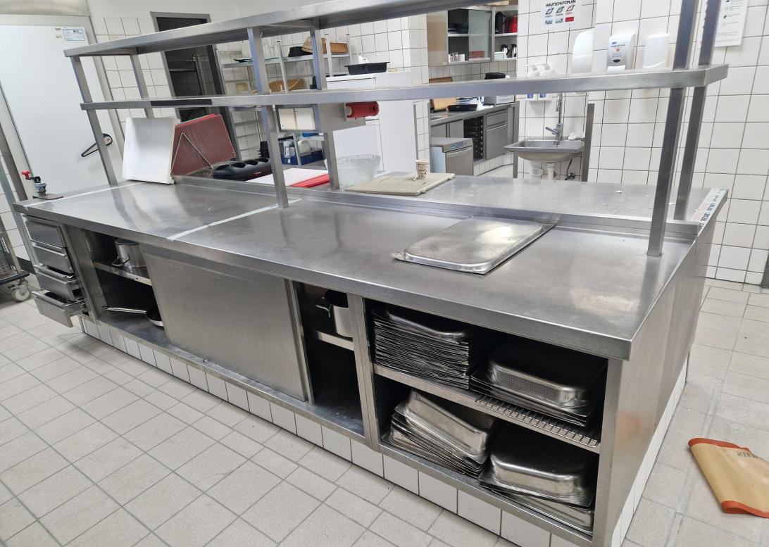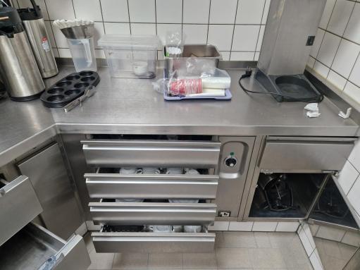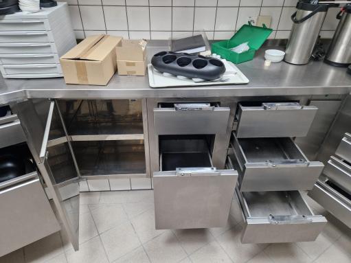 banco cucina con lavello, 2 cassettoni, 5 cassetti porta pentole, 4 cassetti porta bicchieri, strutturato unico su angolo ottuso, misure: