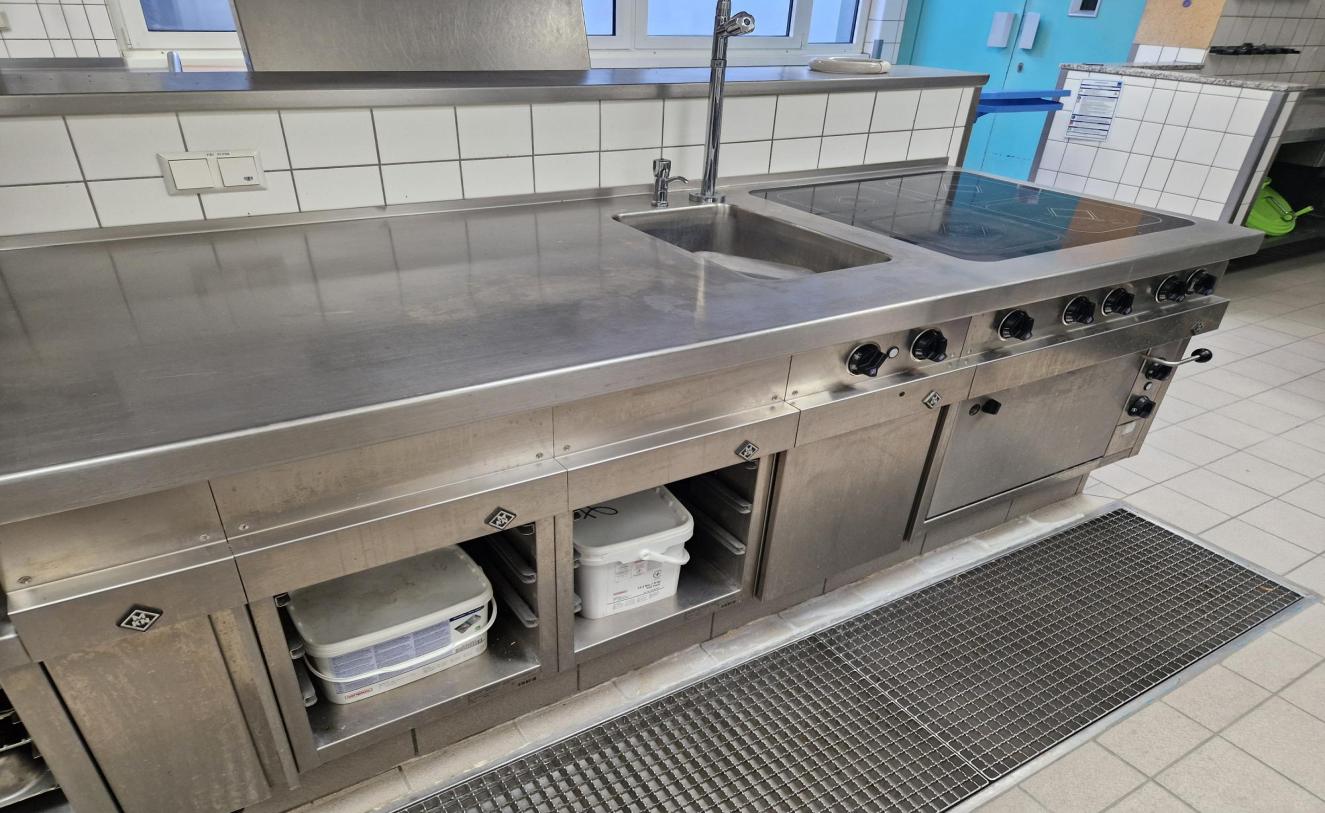 Banco lavoro completo di lavabo con 1 vasche fornello 4 fuochi a induzione, forno e porta pentole a vista, misure 220x84x90h