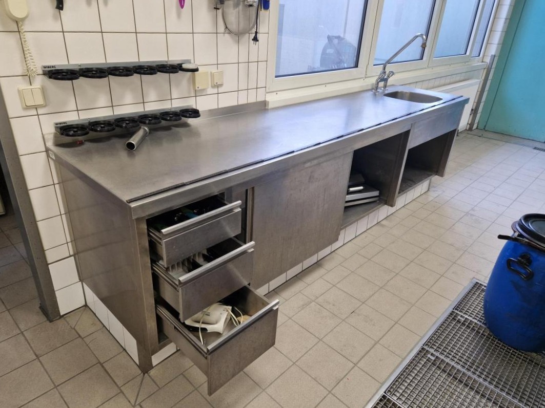 banco lavoro con lavello 1 vasca completo di 3 cassetti e mobiletto centrale ad ante scorrevoli, misure 300X60X82h