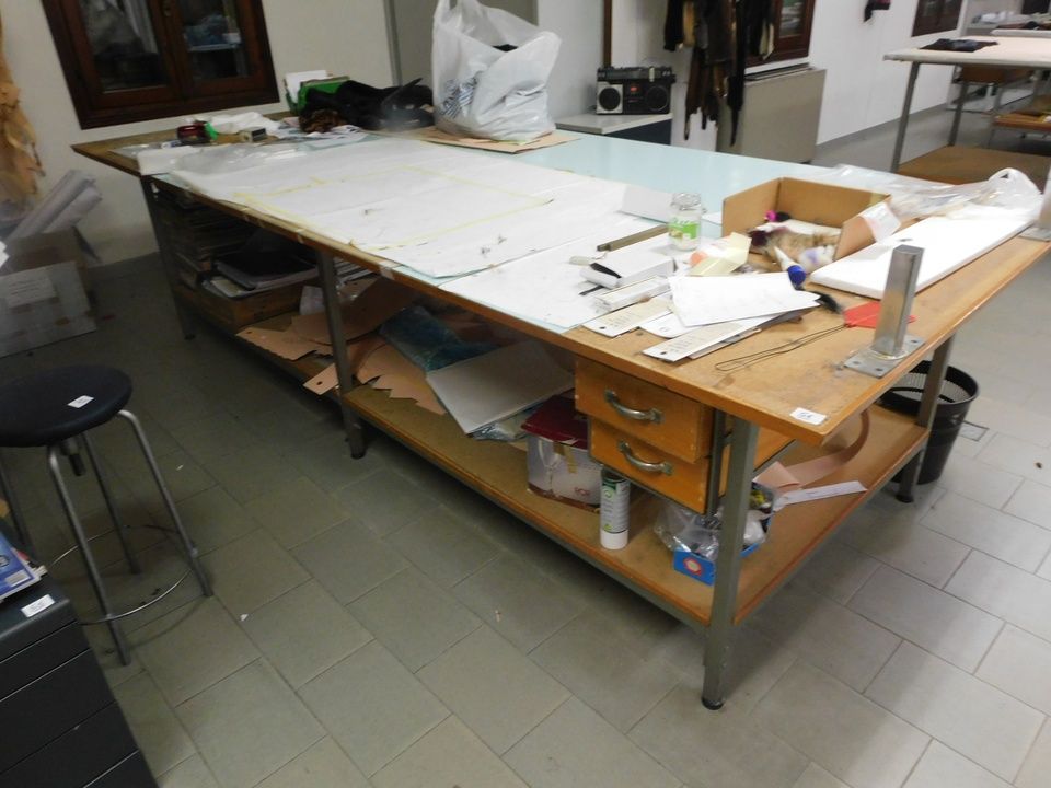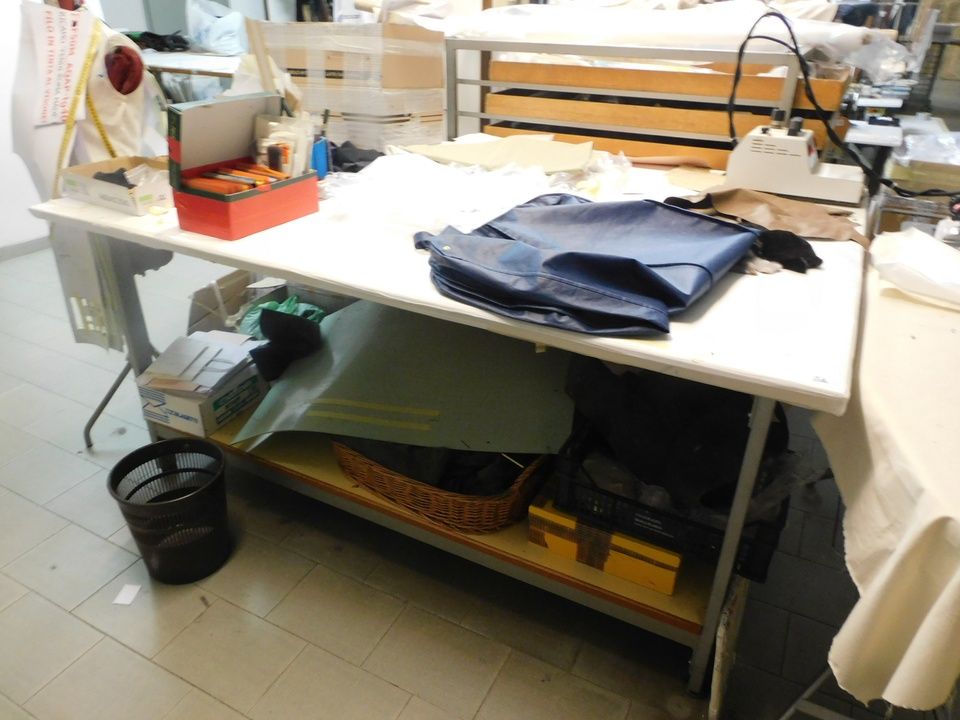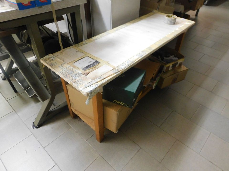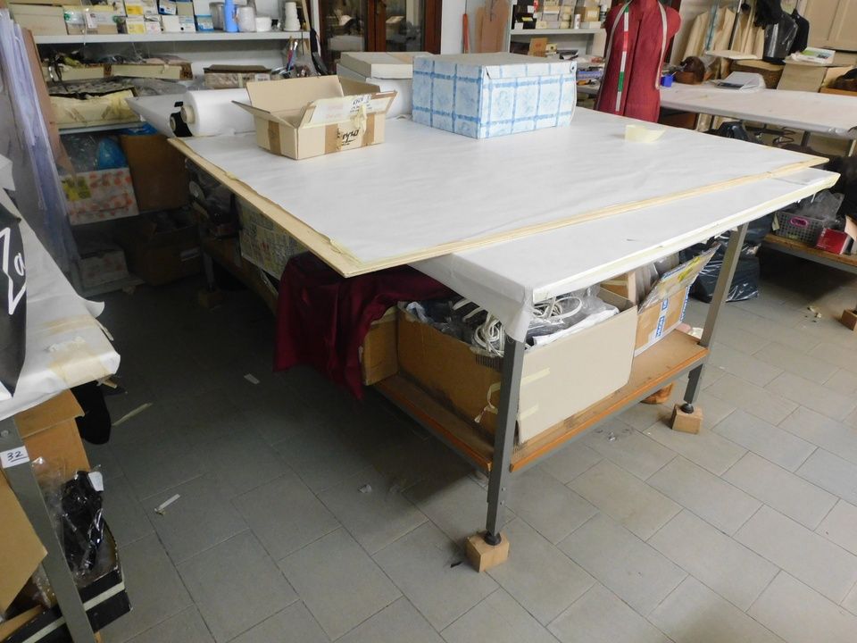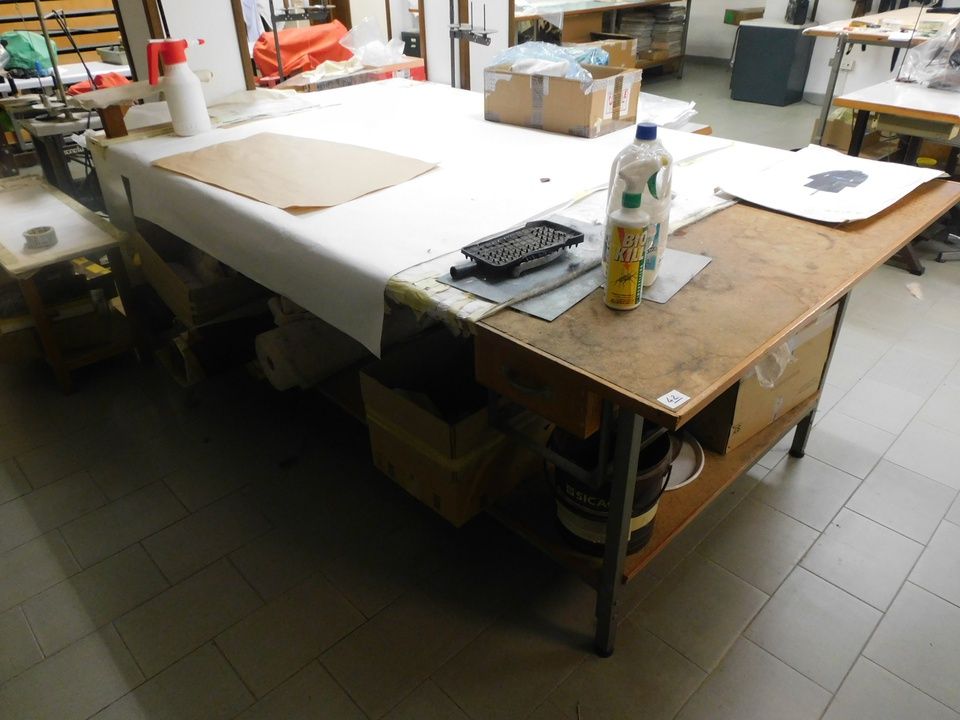 n. 1 tavolo metallico con due piani in legno provvisto di due pressette manuali, n. 3 tavoli metallici con due piani in legno - rif. 32