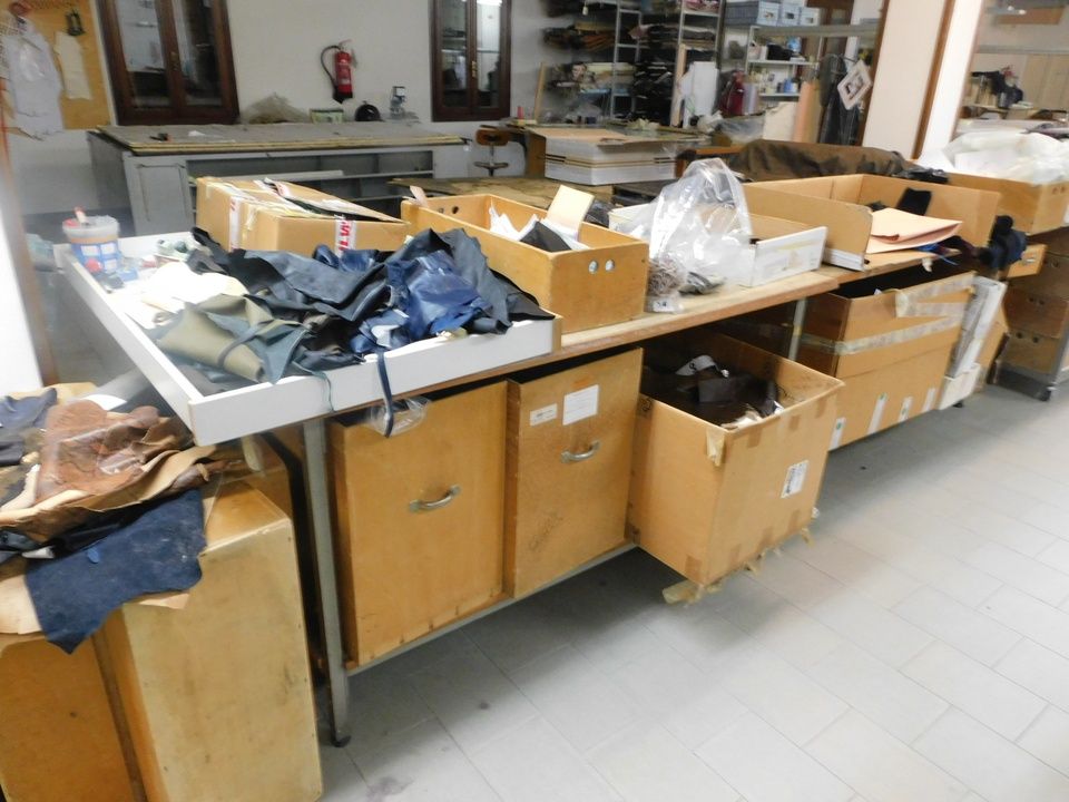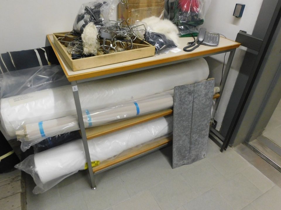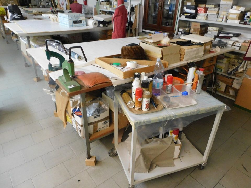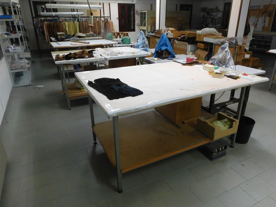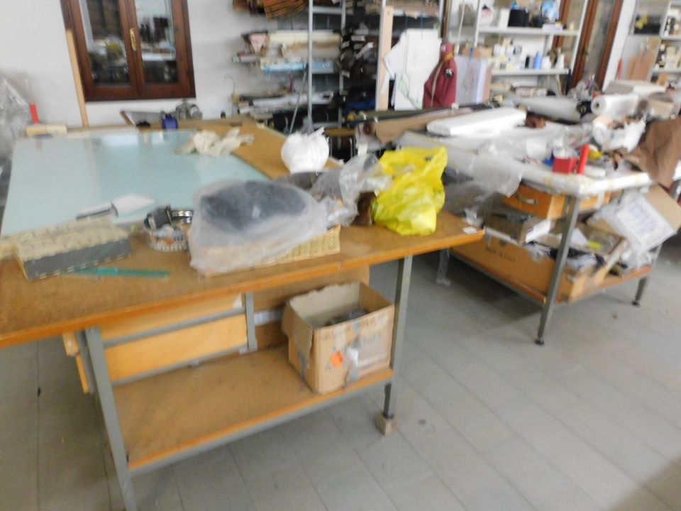 n. 1 tavolo metallico con due piani in legno provvisto di due pressette manuali, n. 3 tavoli metallici con due piani in legno - rif. 32