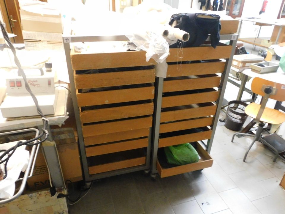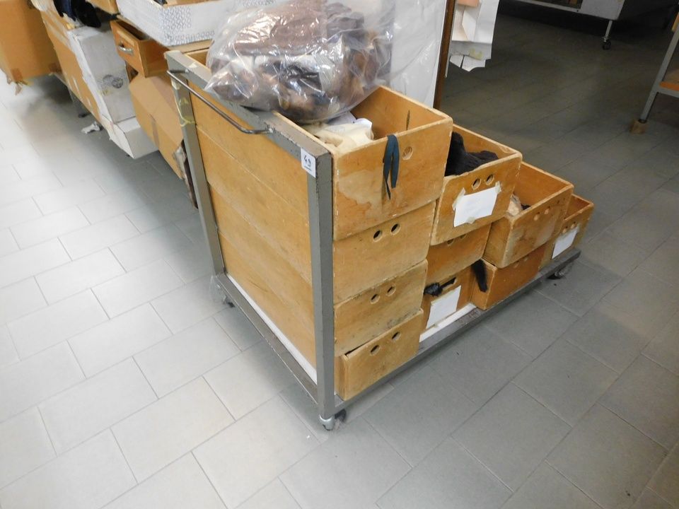 n. 2 carrelli metallici con cassetti in legno, n. 1 carrello a piano basso - rif. 49