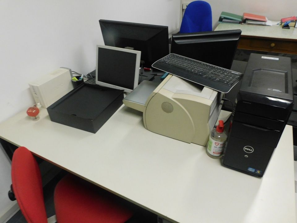 elettronica d'ufficio costituita da: n. 1 monitor HP, n. 1 computer assemblato, n. 1 stampante HP Laserjet CP1525N Color, n. 1 multifunzione Olivetti Mod. D-Copia 3504MF, n. 1 zyxel VPN2S, n. 1 armadio rack pensile contenente una barra multipresa e uno switch Krone, n. 1 monitor DELL, n. 1 monitor ASUS, n. 1 computer assemblato, n. 1 computer DELL Vostro con processore core i7, n. 1 monitor SHARP, n. 1 stampante CANON Mod. Laser-Shot LBP-1210, n. 1 gruppo di continuità APC Mod. BACK-UPS CS650, n. 1 distruggidocumenti TITANIUM 511X, n. 1 vecchio computer, n. 1 televisione SAMSUNG, n. 1 videoregistratore HIKVISION, n. 1 gruppo di continuità TRUST - rif. E1