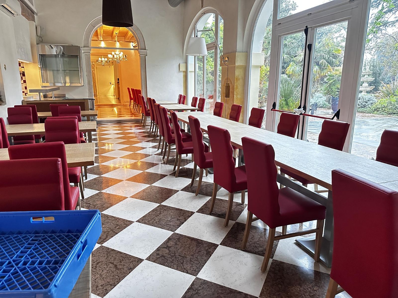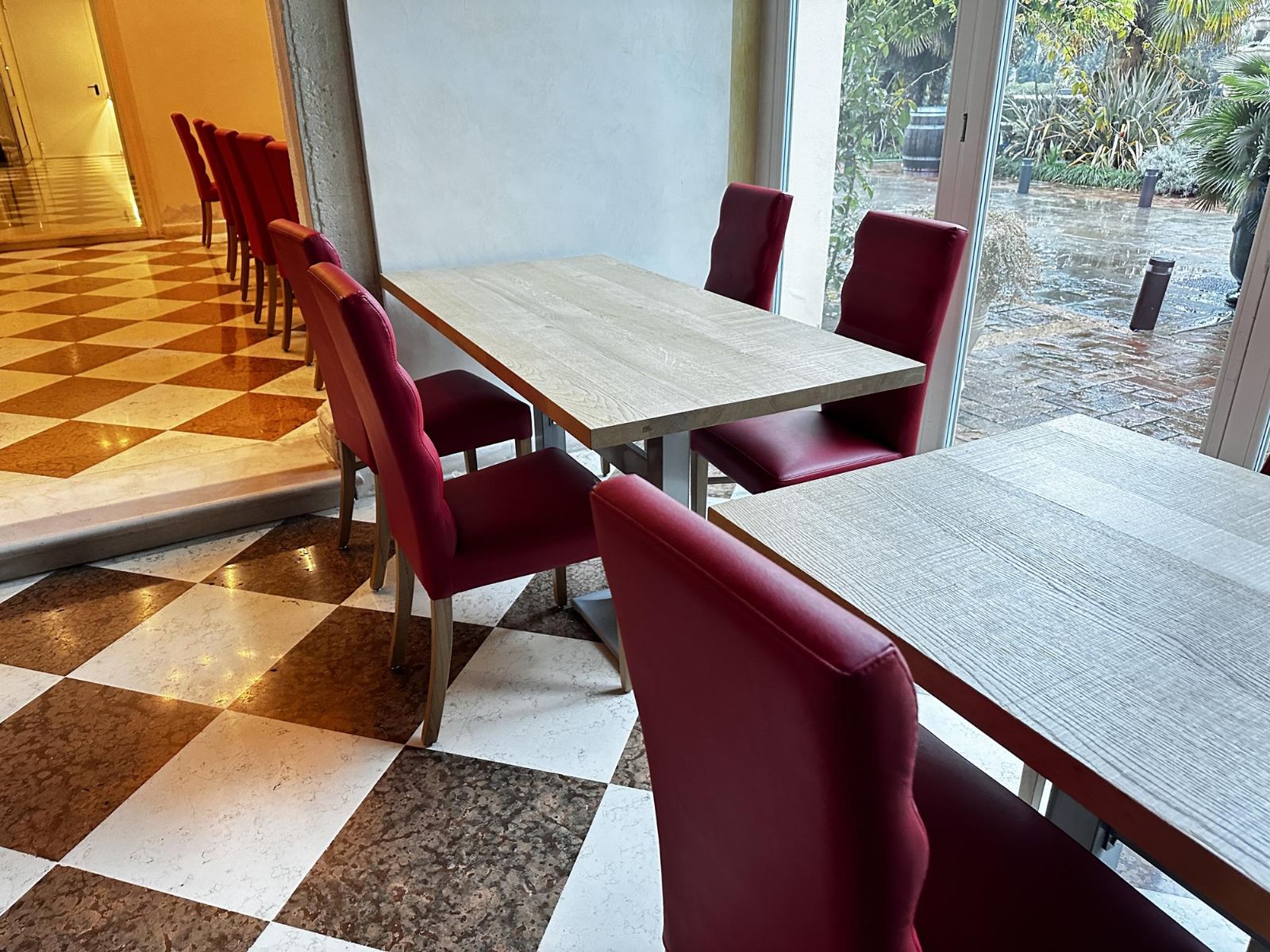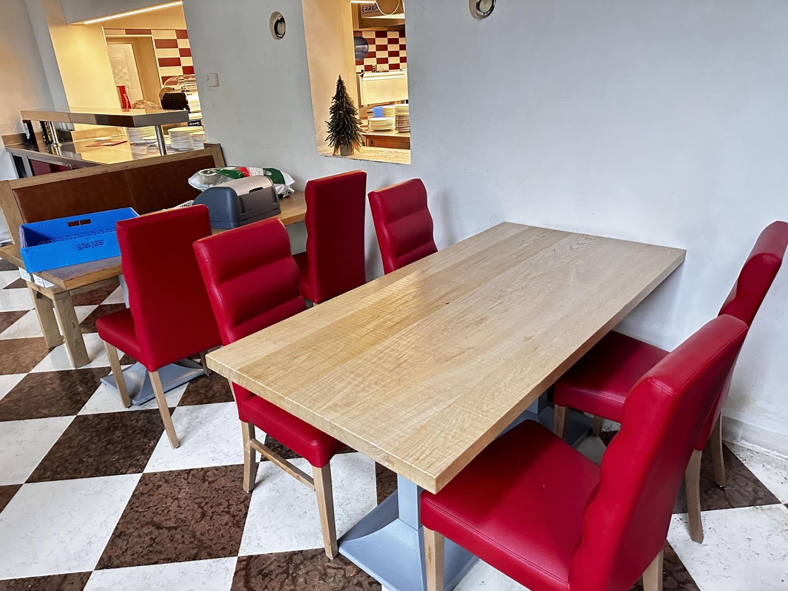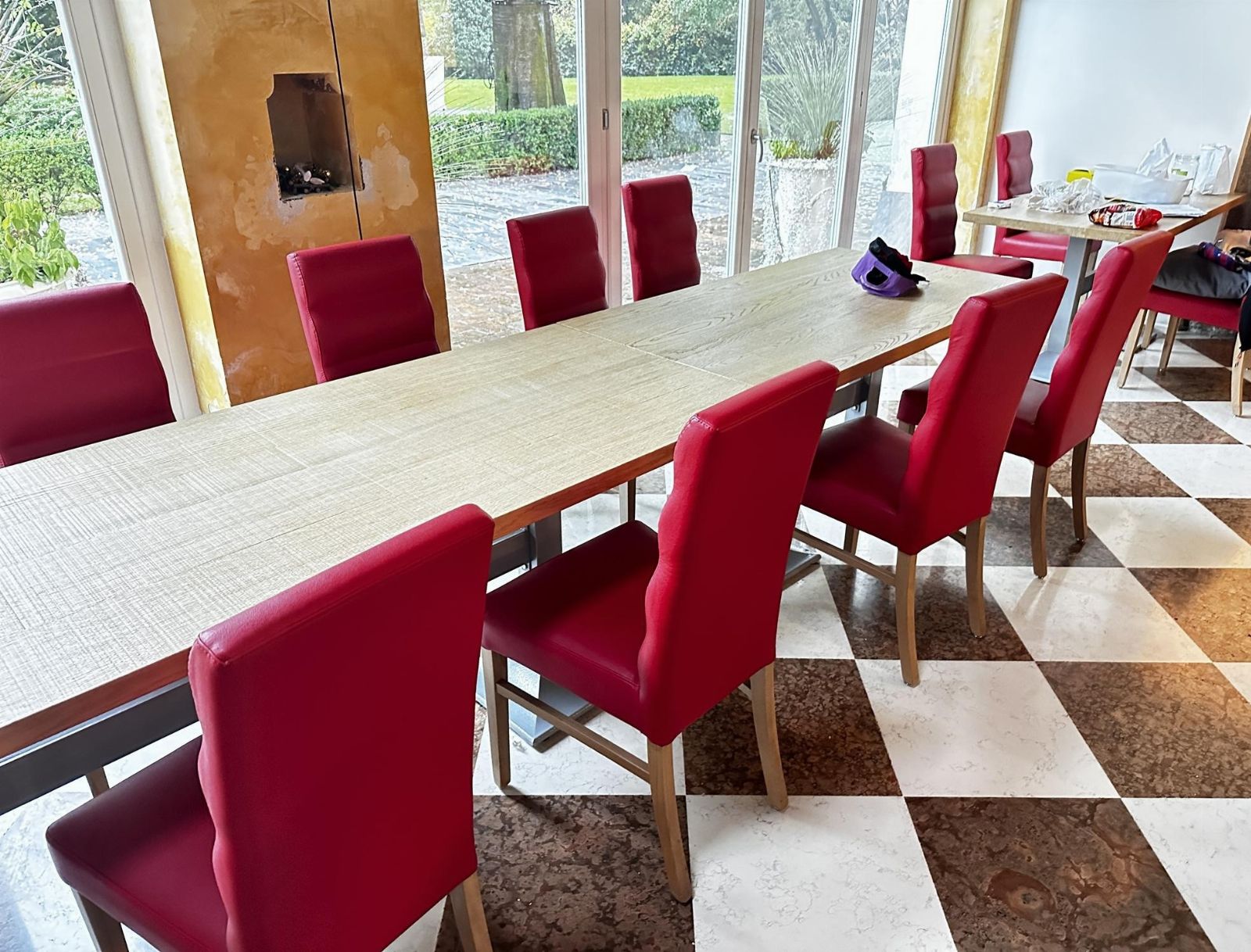 n. 40 Sègia imbottida cun struttura in legn tip rovere natural e seduta imbottida in similpelle rossa