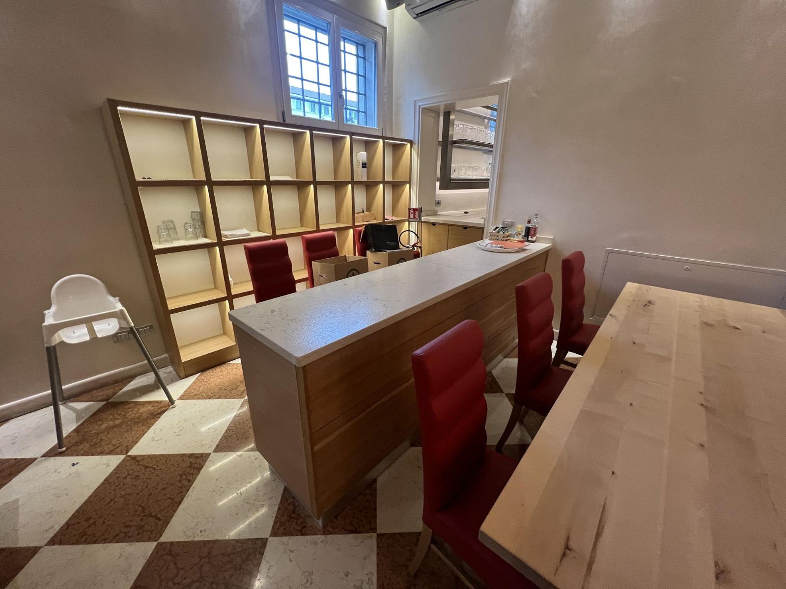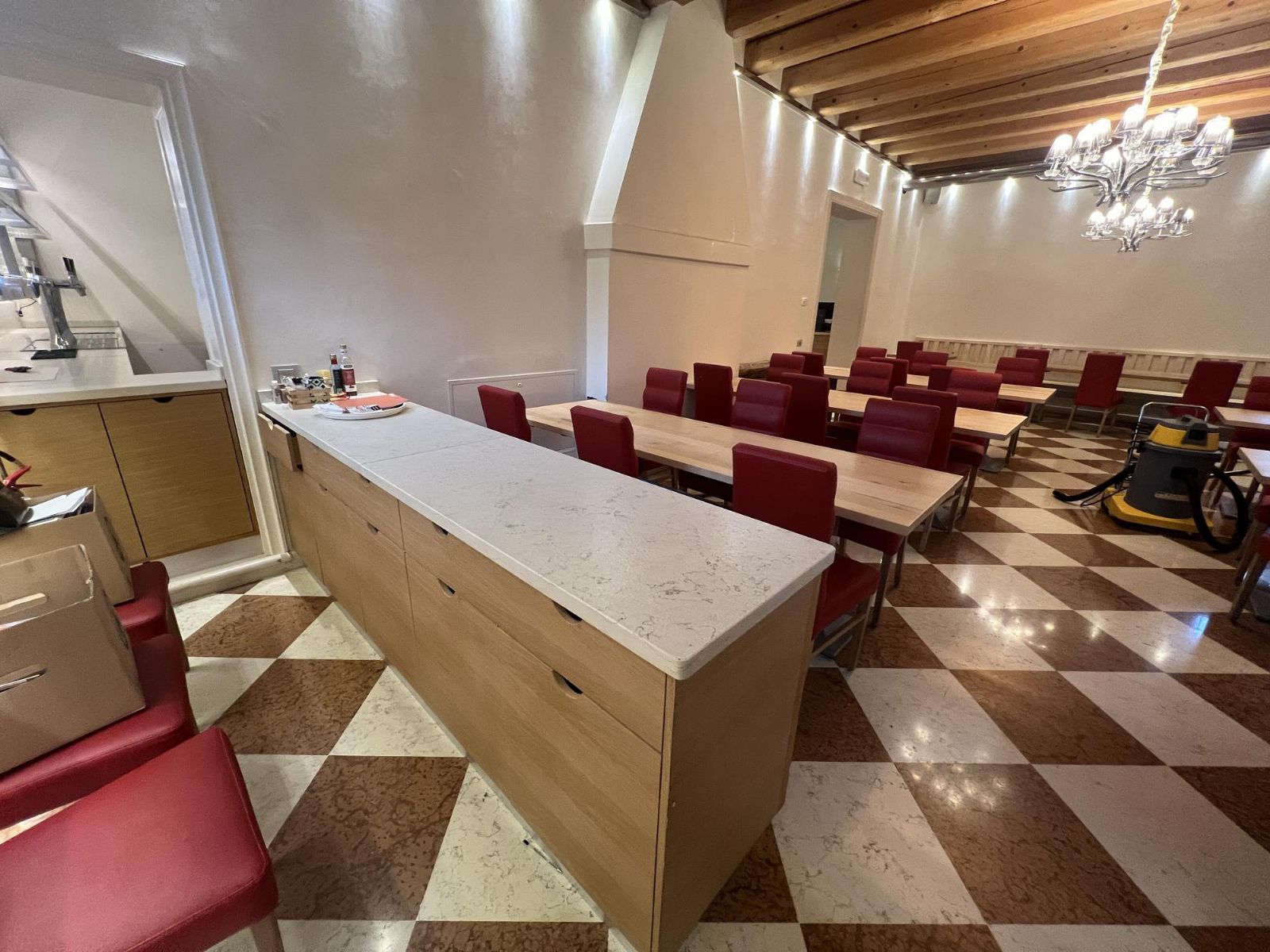 n. Banco de serviz in legn tip rovere natural e pian in marmo bianco cun n. 3 ante battenti e n. 3 cassetti, dimension circa cm 150x50x100