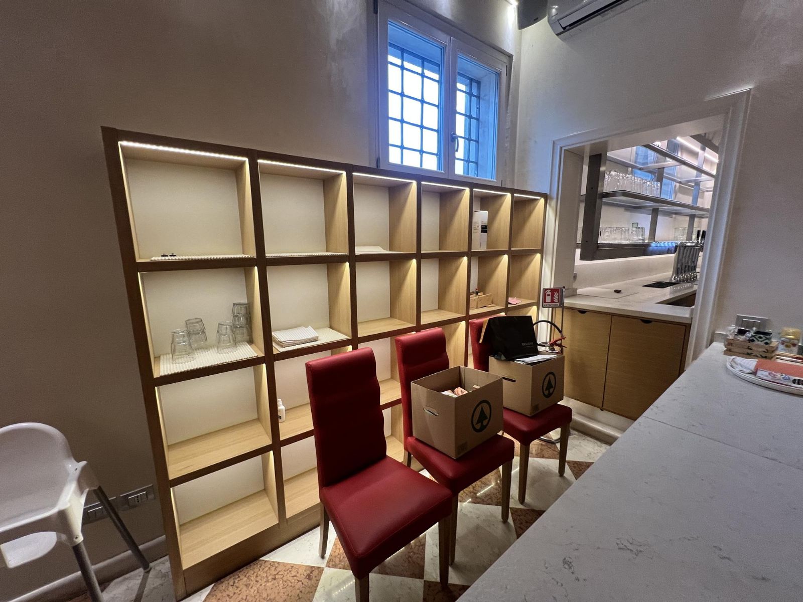 n. 1 Struttura porta bottiglie realizzada su misura, installada a parete, Realizzada in laminat de legn tip rovere natural. Cun nicchie quadrate a giò. Altezza totala stimada: circa 1,60 m, larghezza complessiva: 2,40 m.