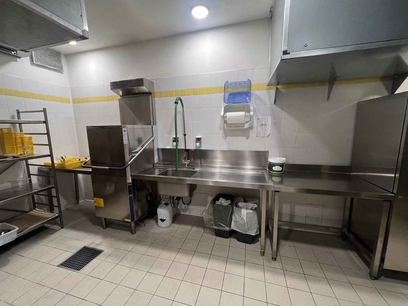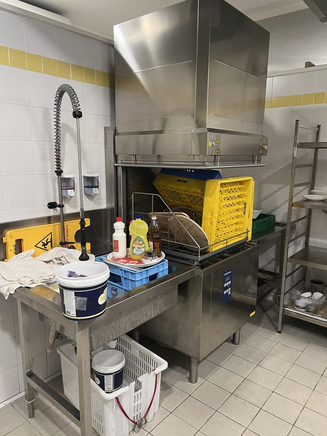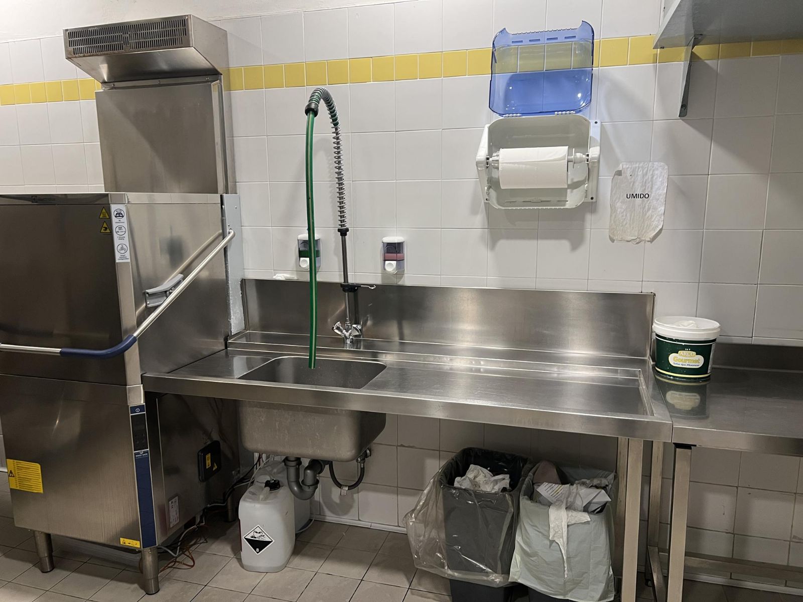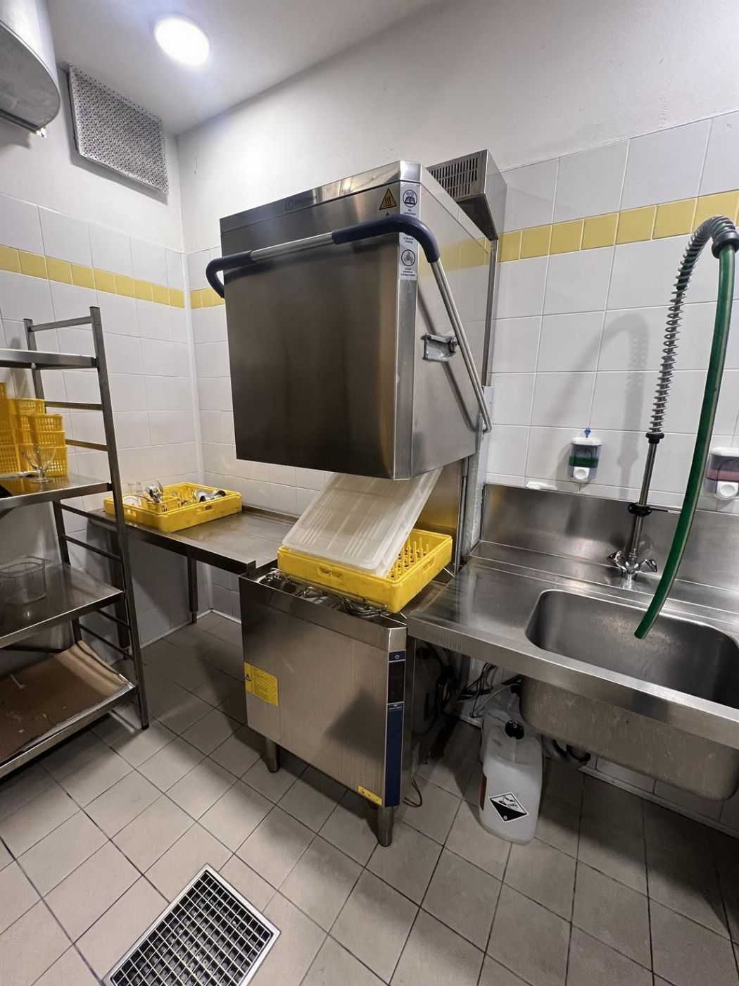 n. 1 Mașină de spălat vase industrială automată cu capot marca ELECTROLUX model EHT8IELG anul 2019 cu blat din oțel inoxidabil și cu chiuvetă rectangulară din oțel inoxidabil de dimensiuni aproximative cm 200x50x85