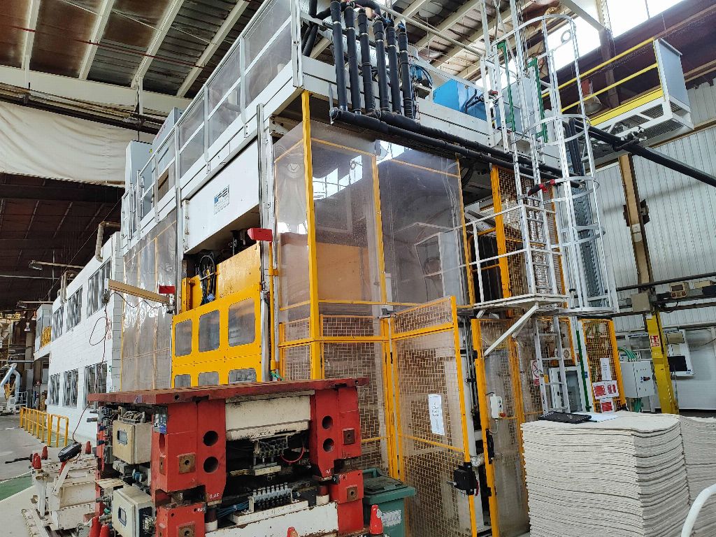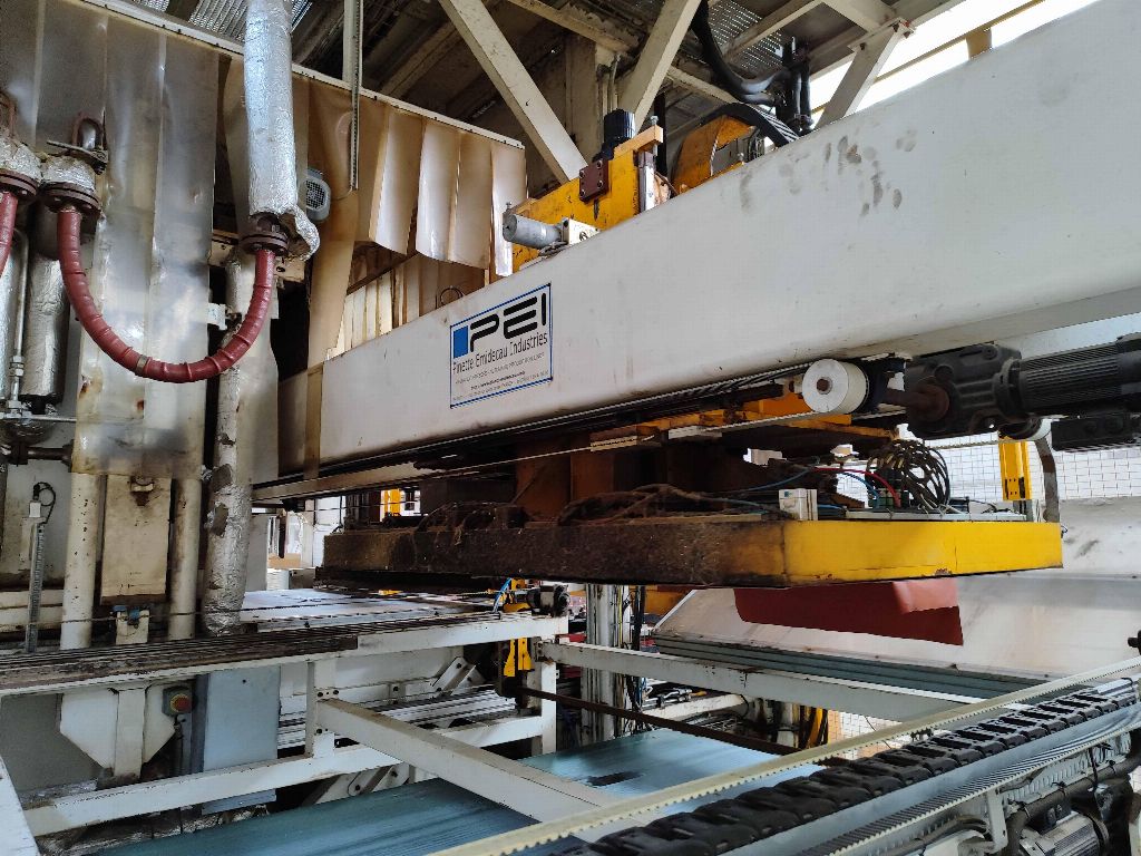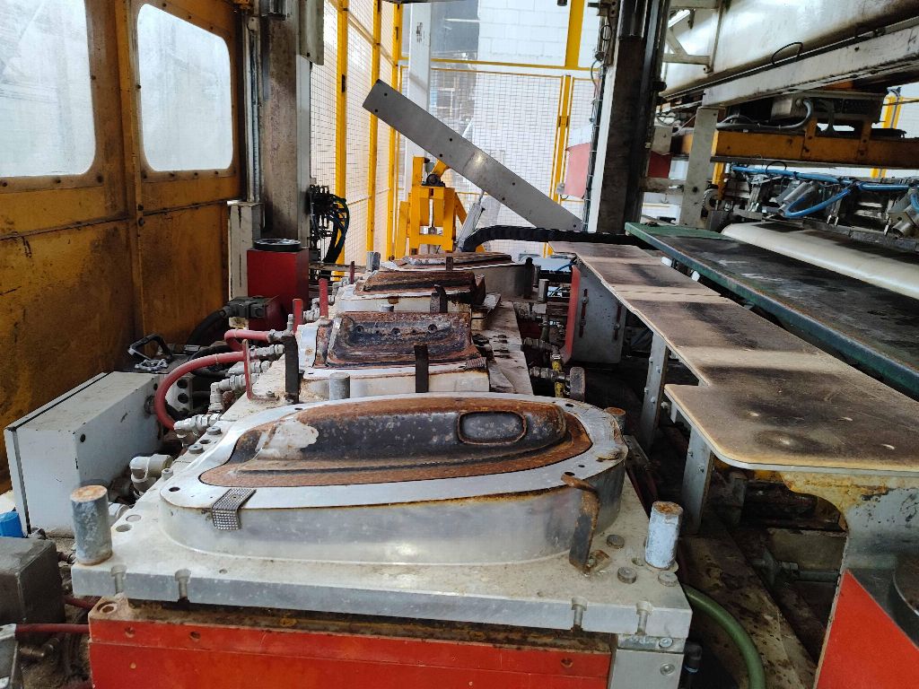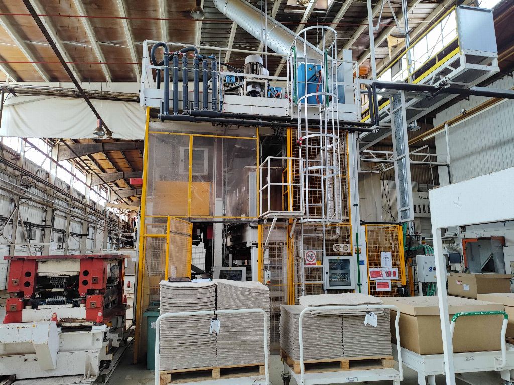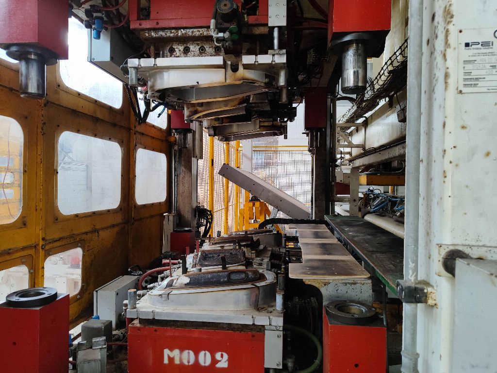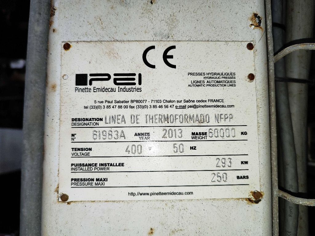 NFPP termoformaj hattı LP01, PEI PINETTE markası ONESHOT 1 presi, no: 61983A, kapasite 150 Tm, güç 293 Kw, yıl 2013, sıcak kalibrasyon presi, 2 hızlı kalıp değiştirme aracı, soğutma ekipmanı.